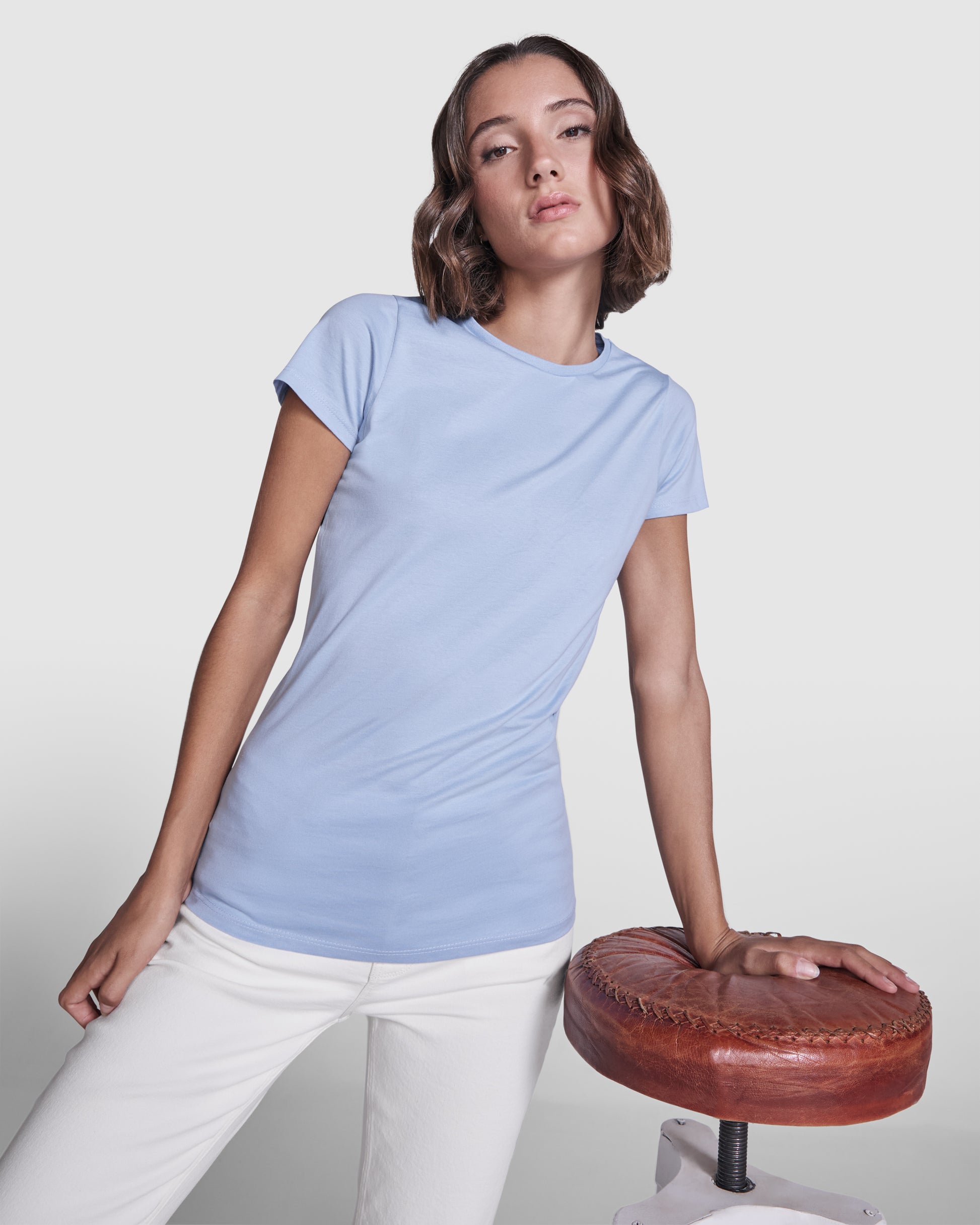 Camiseta de mujer entallada de manga corta en algodón orgánico certificado OCS. Cuello redondo en canalé 1×1. Cubrecosturas reforzado en cuello. Costuras laterales.