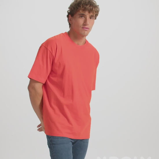 Camiseta de manga corta estilo oversize. Cuello redondo ribeteado en canalé 2×1 con cubrecosturas a tono. Costuras laterales. Doble costura ancha en manga y bajo.