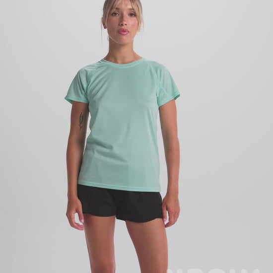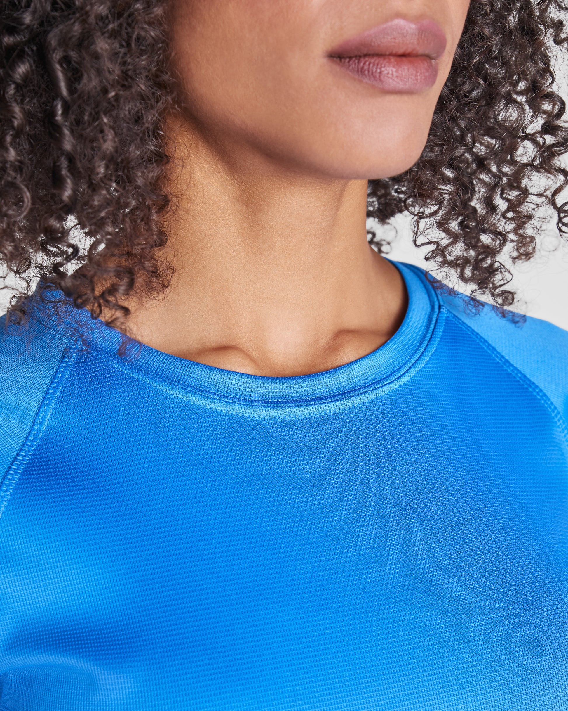 Camiseta técnica entallada de manga corta ranglán para mujer, con cuello redondo y cubrecosturas a tono. Paneles inferiores en mangas. Remallado a tono en sisa y panel de manga. Tejido CONTROL DRY.