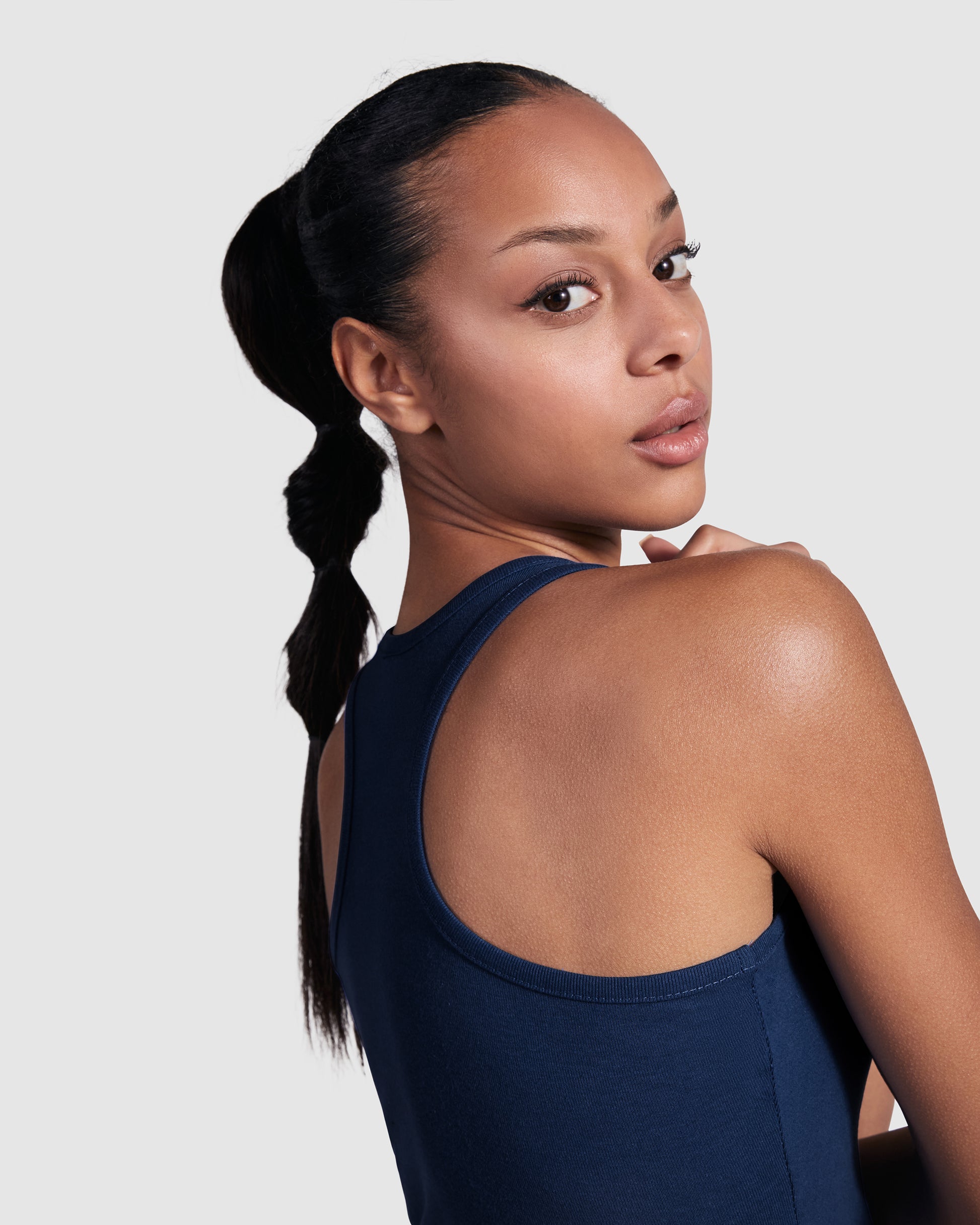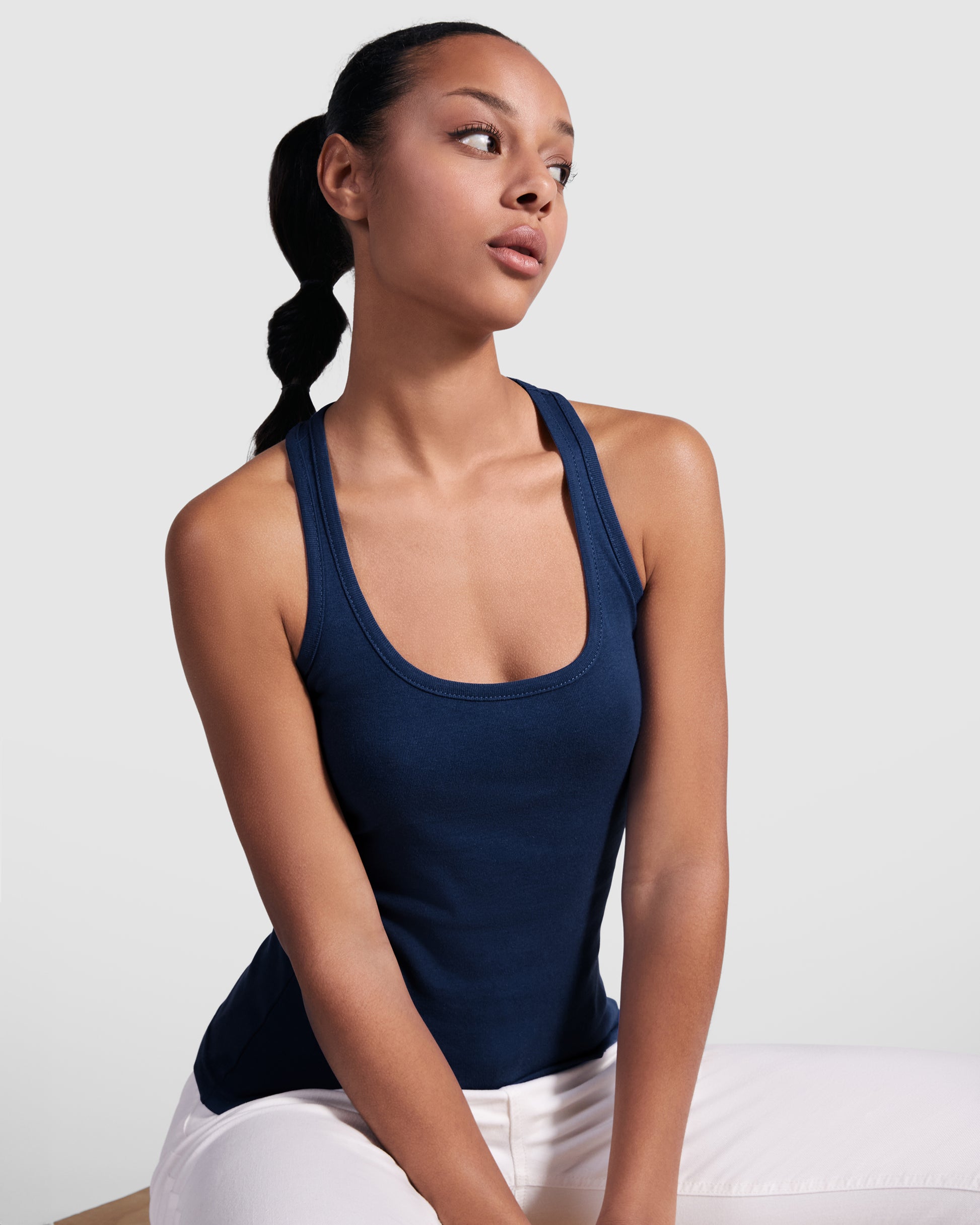 Camiseta entallada, con sisas y escote ribeteado, ancho y enrollado. Espalda estilo nadadora y costuras laterales.