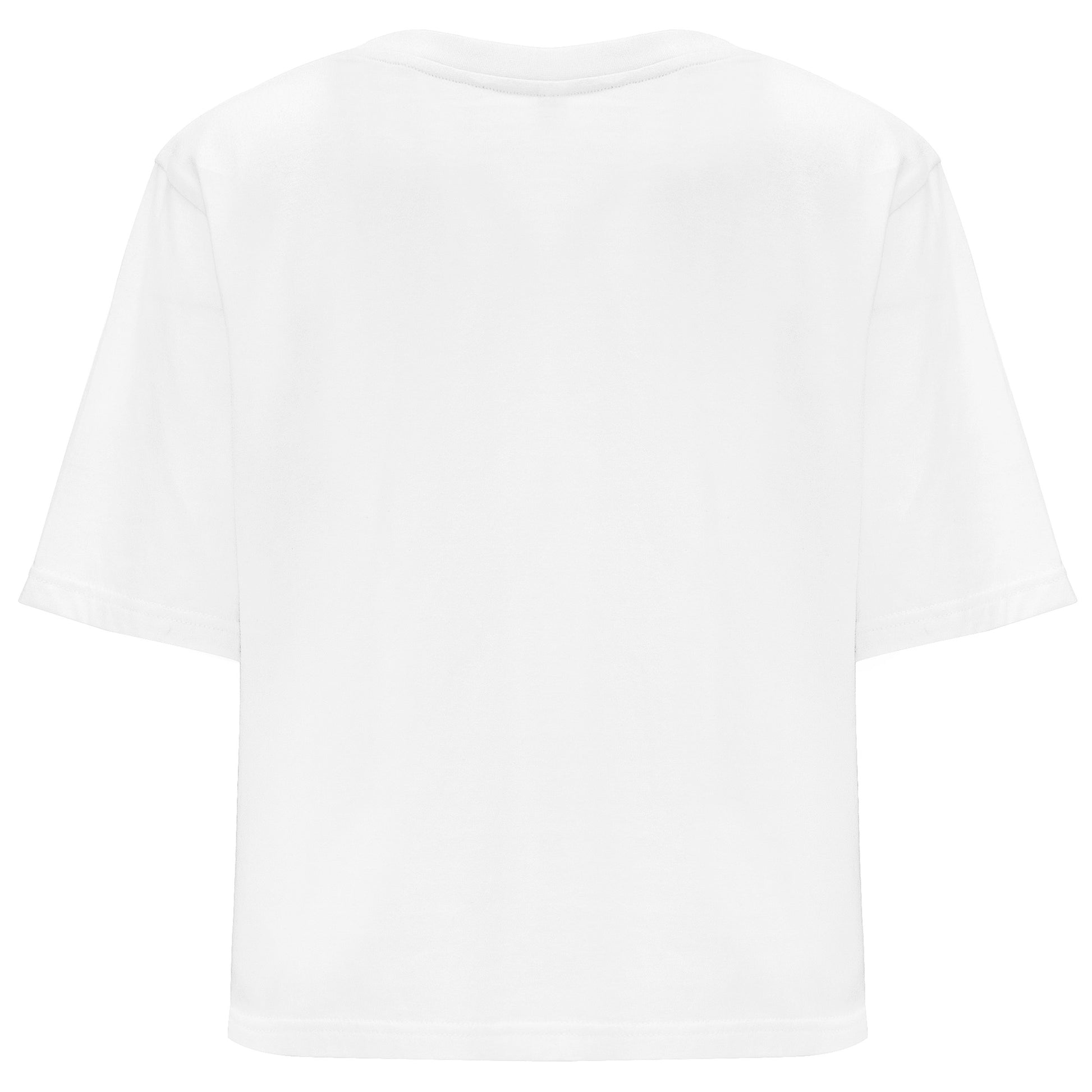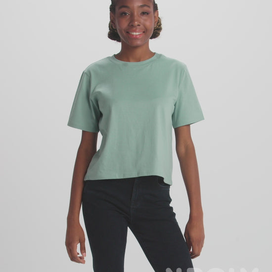 Camiseta de talle corto y holgado para mujer con manga corta. Cuello redondo con ribete ancho en canalé 1×1. Cubrecosturas reforzado a tono.