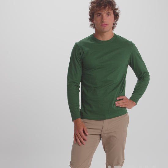 Camiseta de manga larga, tejido tubular y cuello redondo de 4 capas. Cubrecosturas de refuerzo en cuello y hombro. Sin puños.