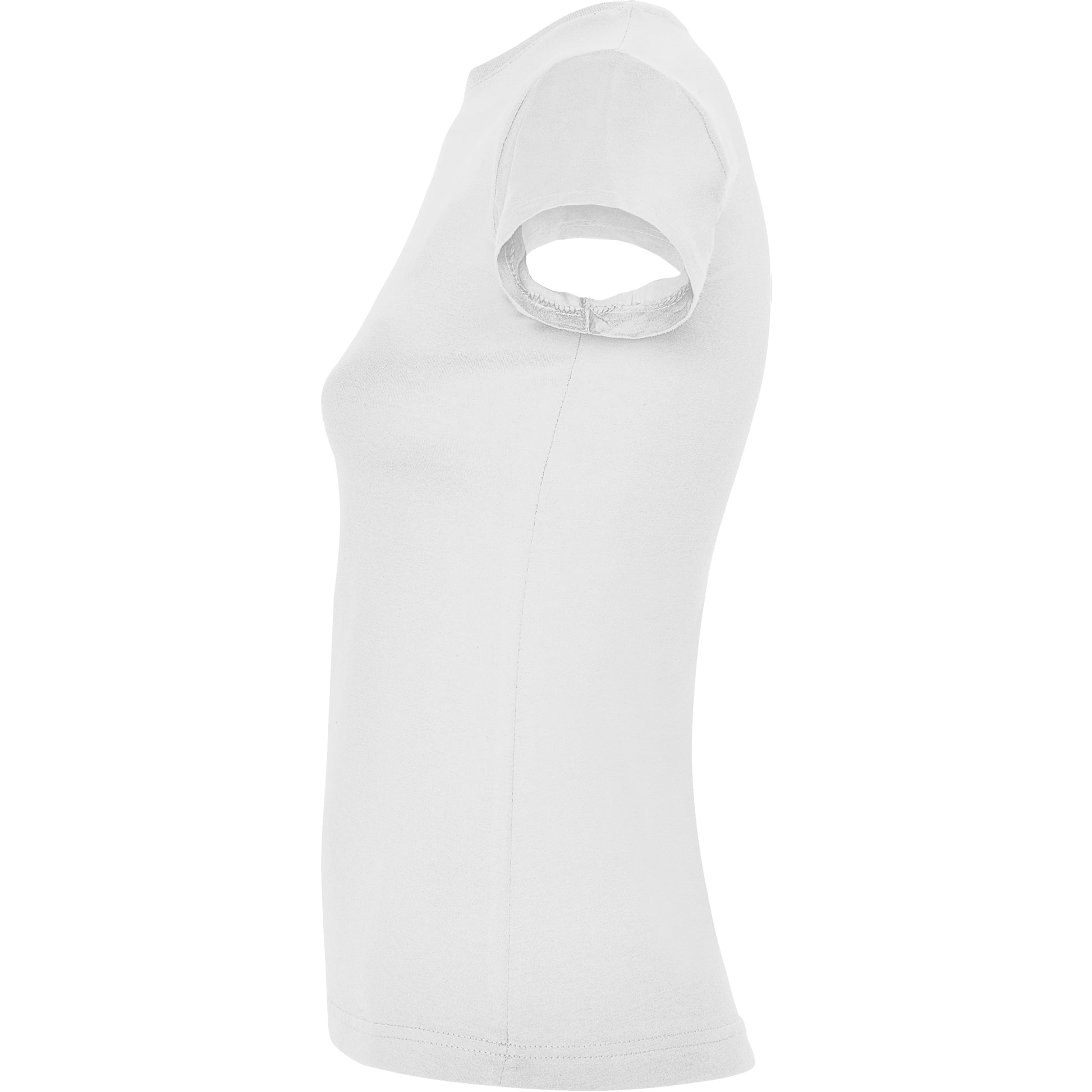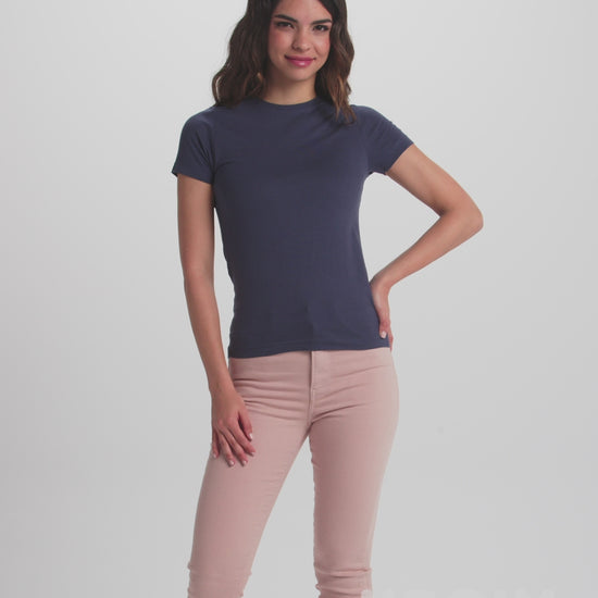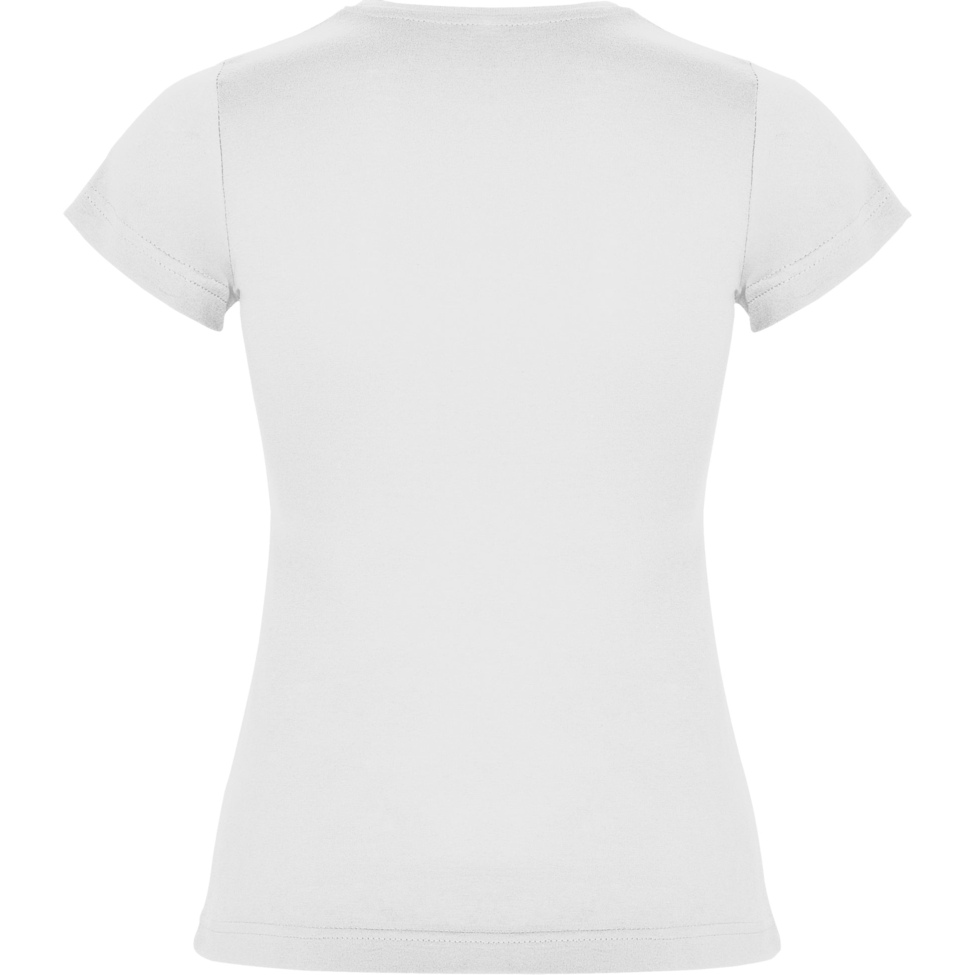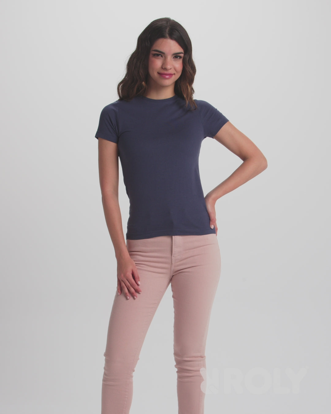 Camiseta de manga corta entallada. Cuello redondo de dos capas en canalé 1×1 con cubre costuras de hombro a hombro. Costuras laterales.