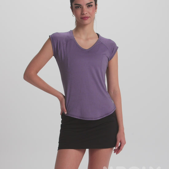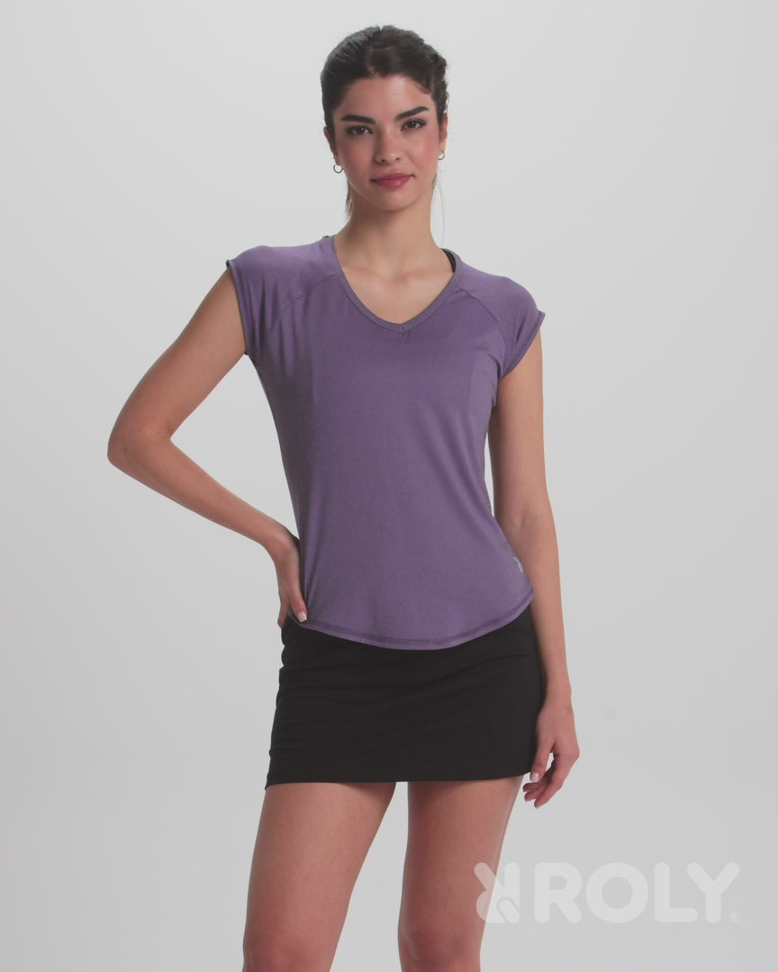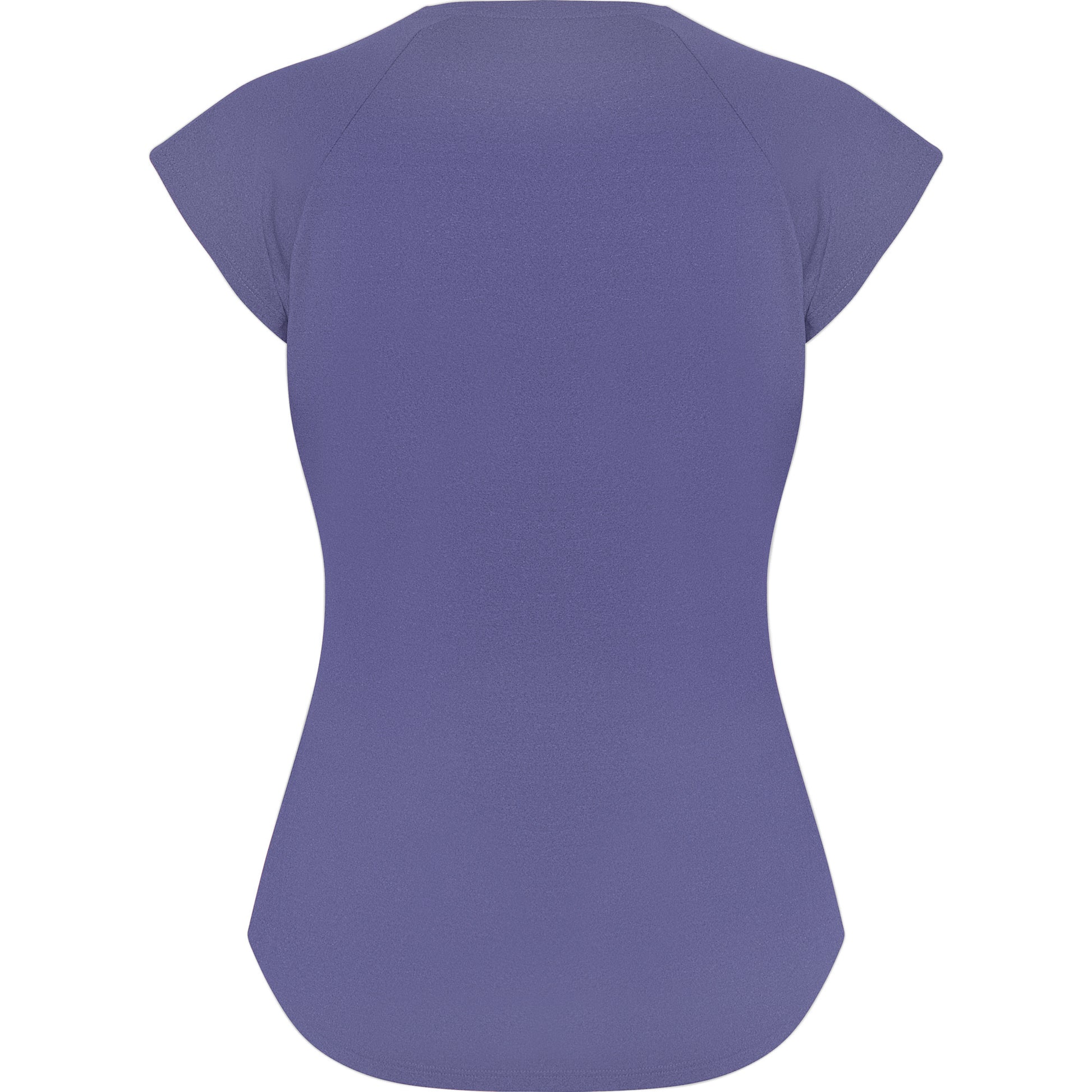 Camiseta técnica multideporte para mujer con manga ranglán. Cuello pico. Tejido poliéster con tacto algodón. Corte entallado. Bajo con forma curva. Costuras overlock a tono en bajo y mangas. Logo Roly reflectante en bajo lateral izquierdo.