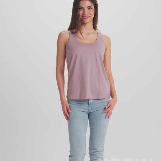 Camiseta amplia de mujer de tirante ancho. Escote y sisas en canalé 1×1. Bajo con forma redondeada. Costuras laterales.