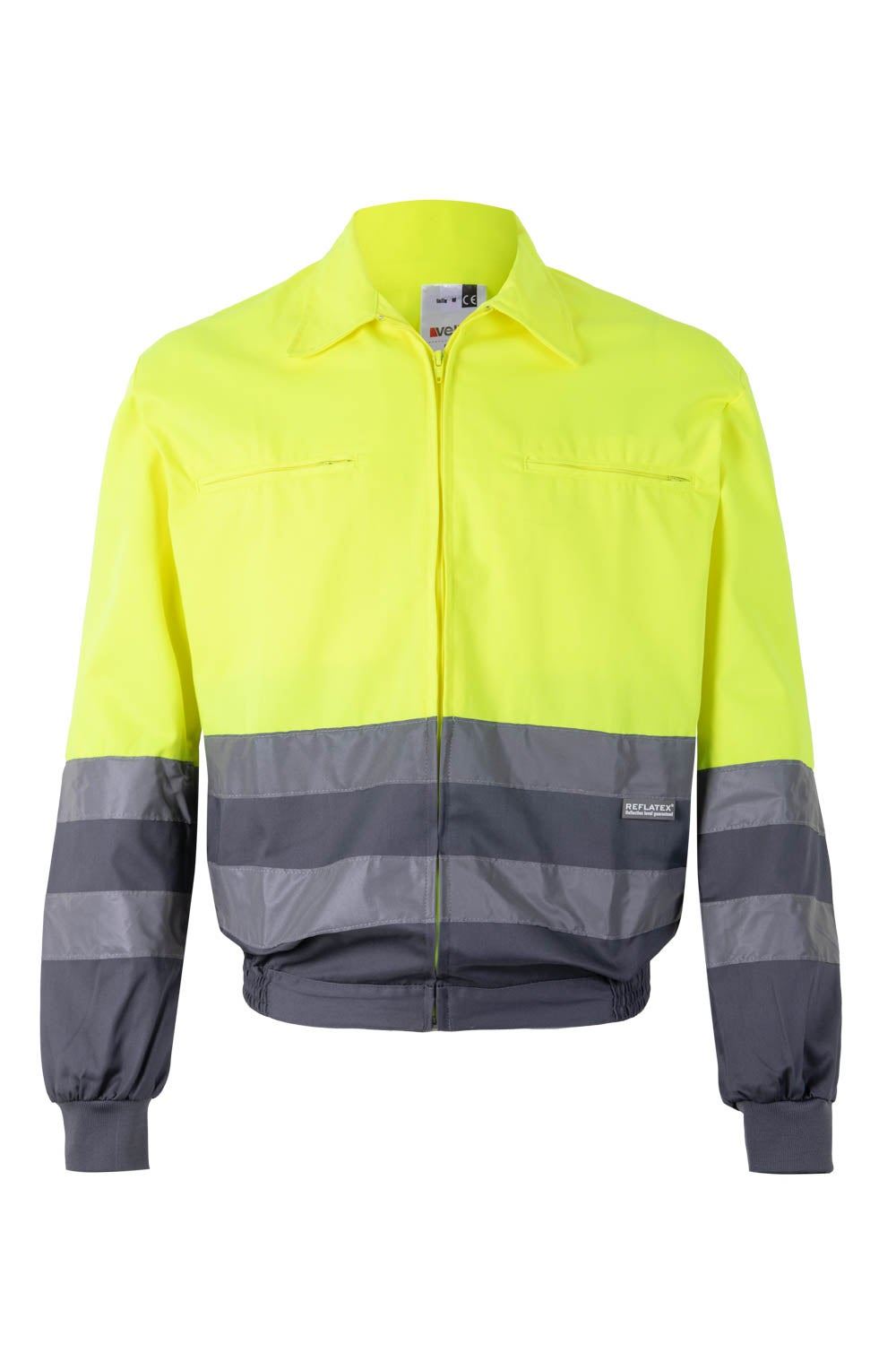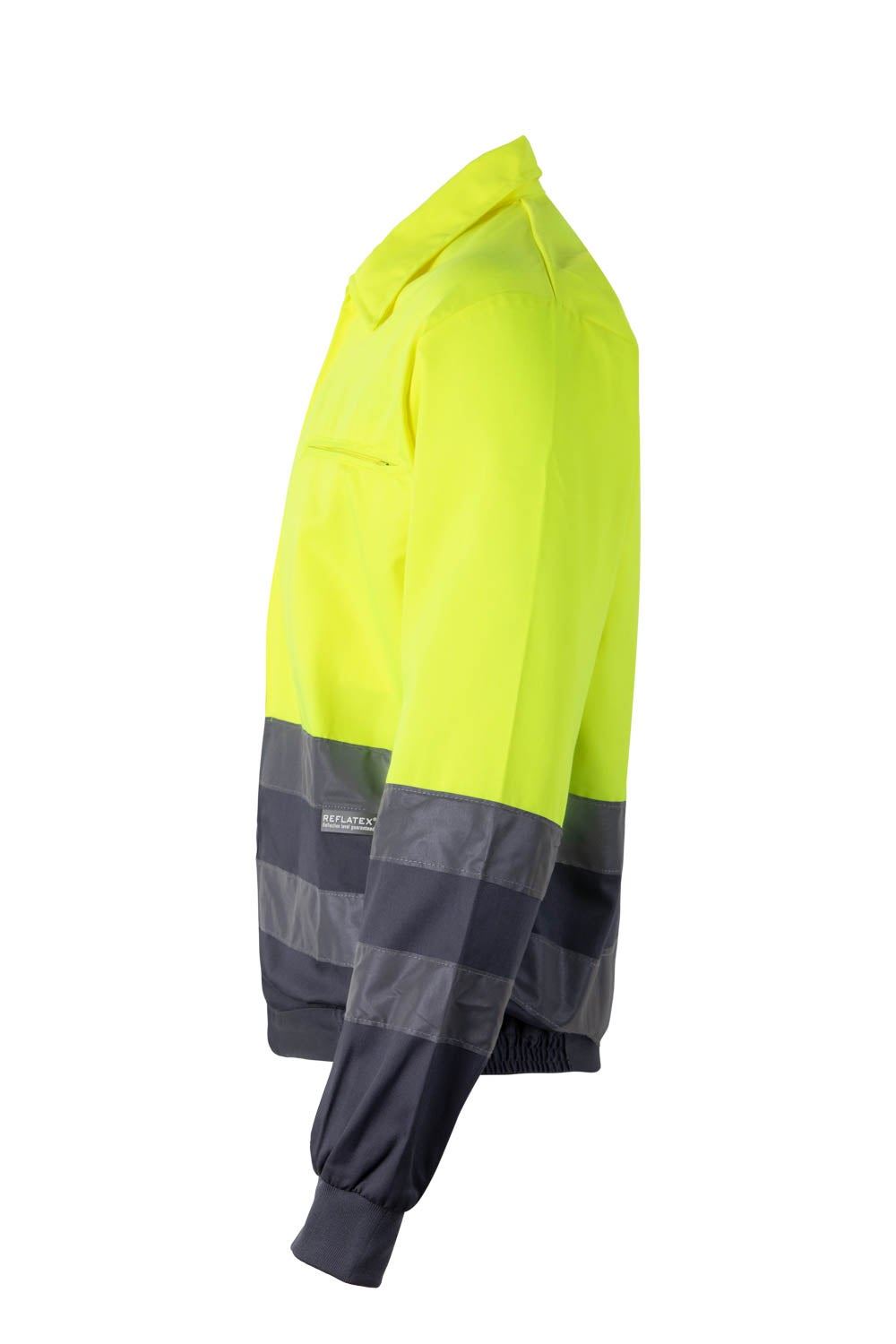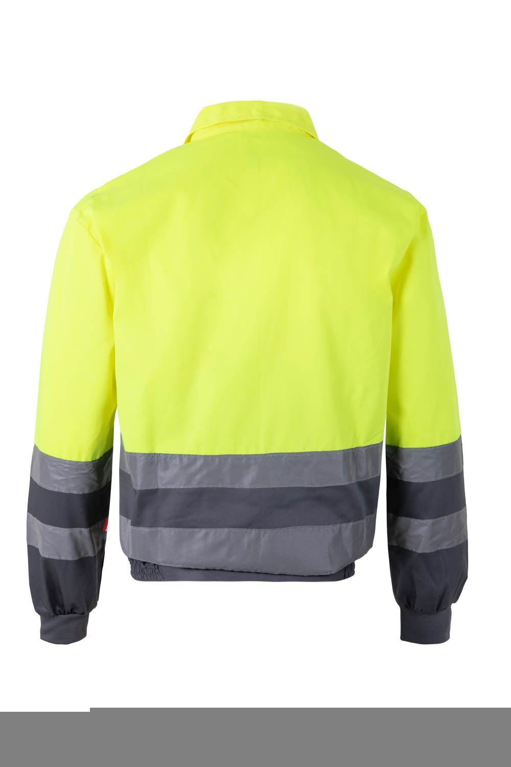 Cazadora bicolor de alta visibilidad con cintas reflectantes en torso y mangas.