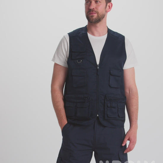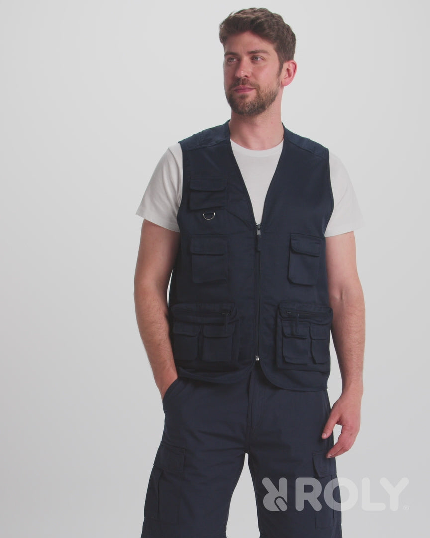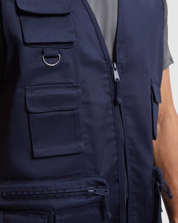 Chaleco laboral multibolsillos con cuello en pico.