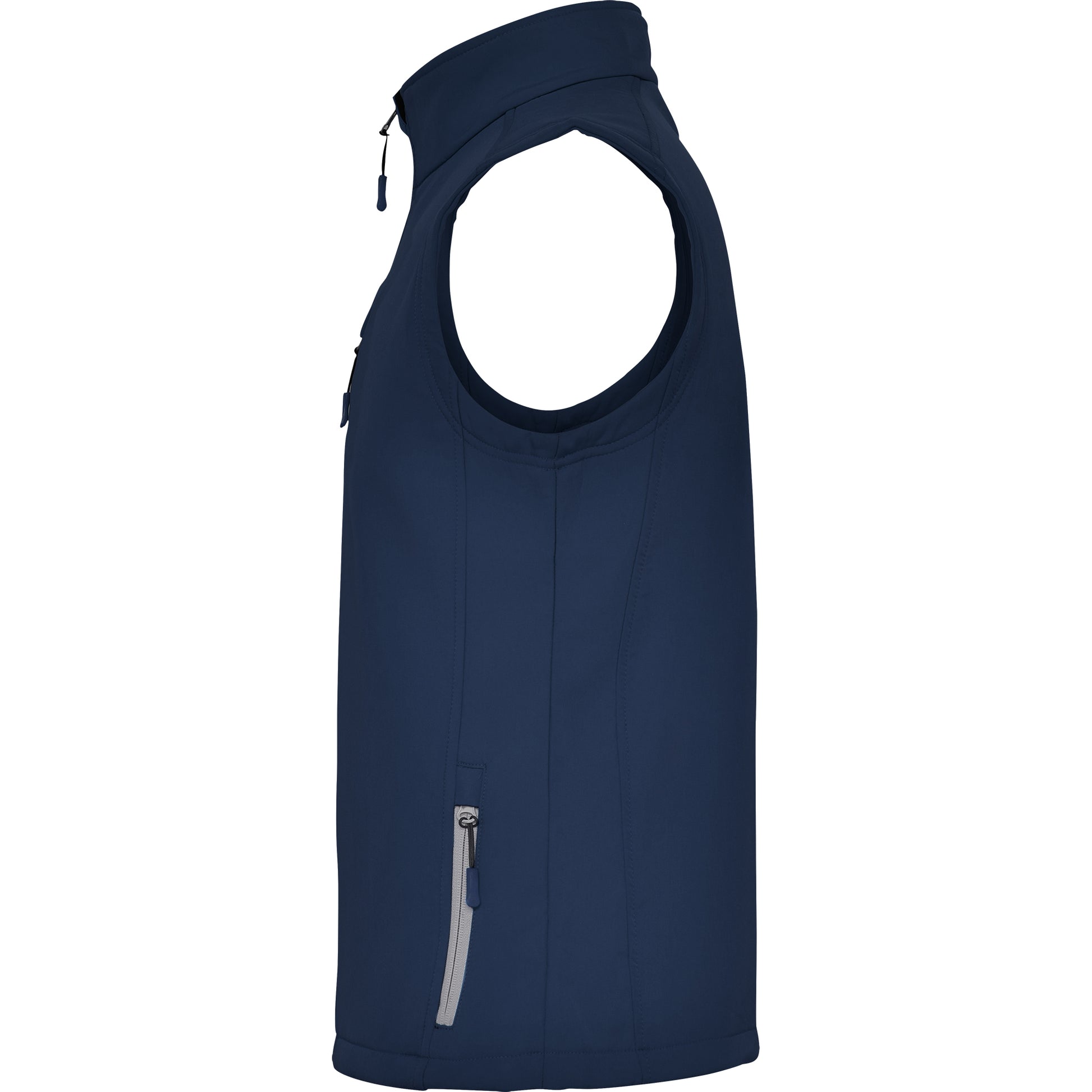 Chaleco softshell compuesto por 2 capas. Interior cálido en tejido micropolar. Cremallera central invertida a contraste con protector de barbilla y tirador. Dos bolsillos laterales y uno en el pecho con cremallera. Bajo con ajustadores interiores laterales.