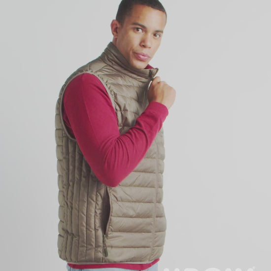 Chaleco de hombre acolchado tacto pluma. Cuenta con cremalleras invertidas a tono y dos bolsillos frontales con cremalleras. Forro interior a contraste. Ribete elástico a tono en el bajo. Prenda ligera y plegable. Corte entallado en modelo para mujer.