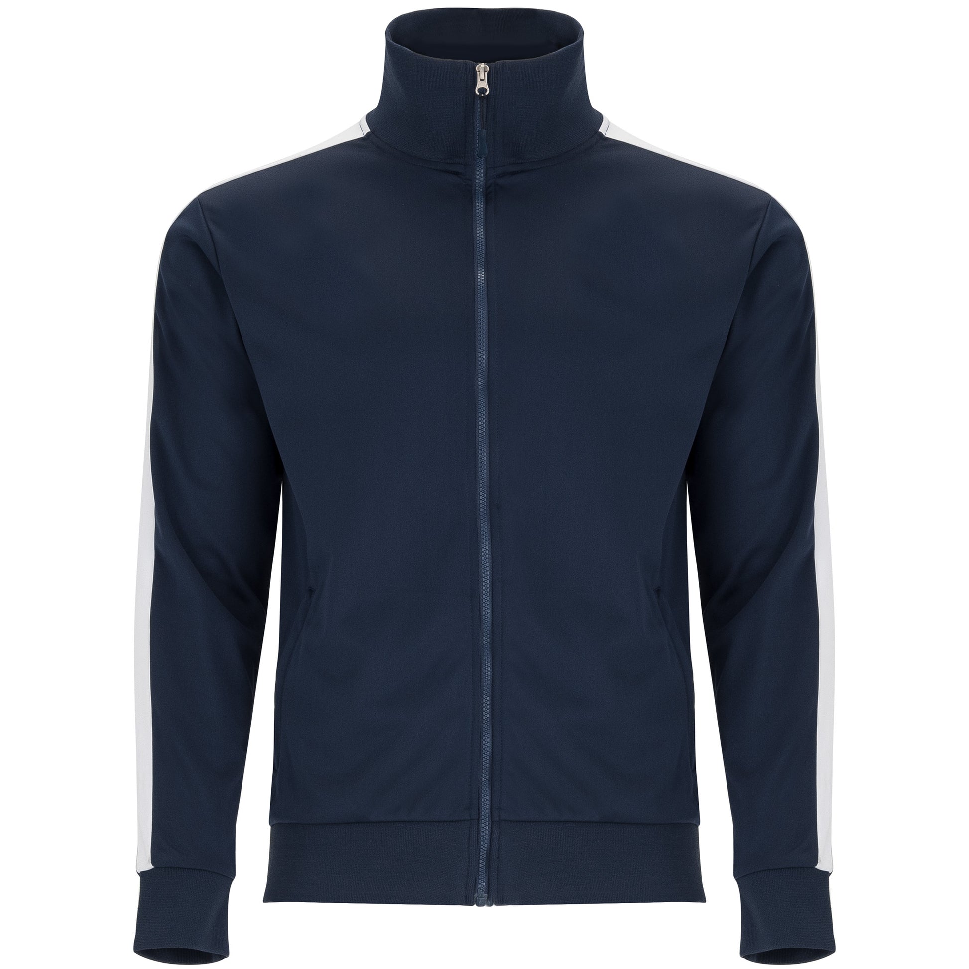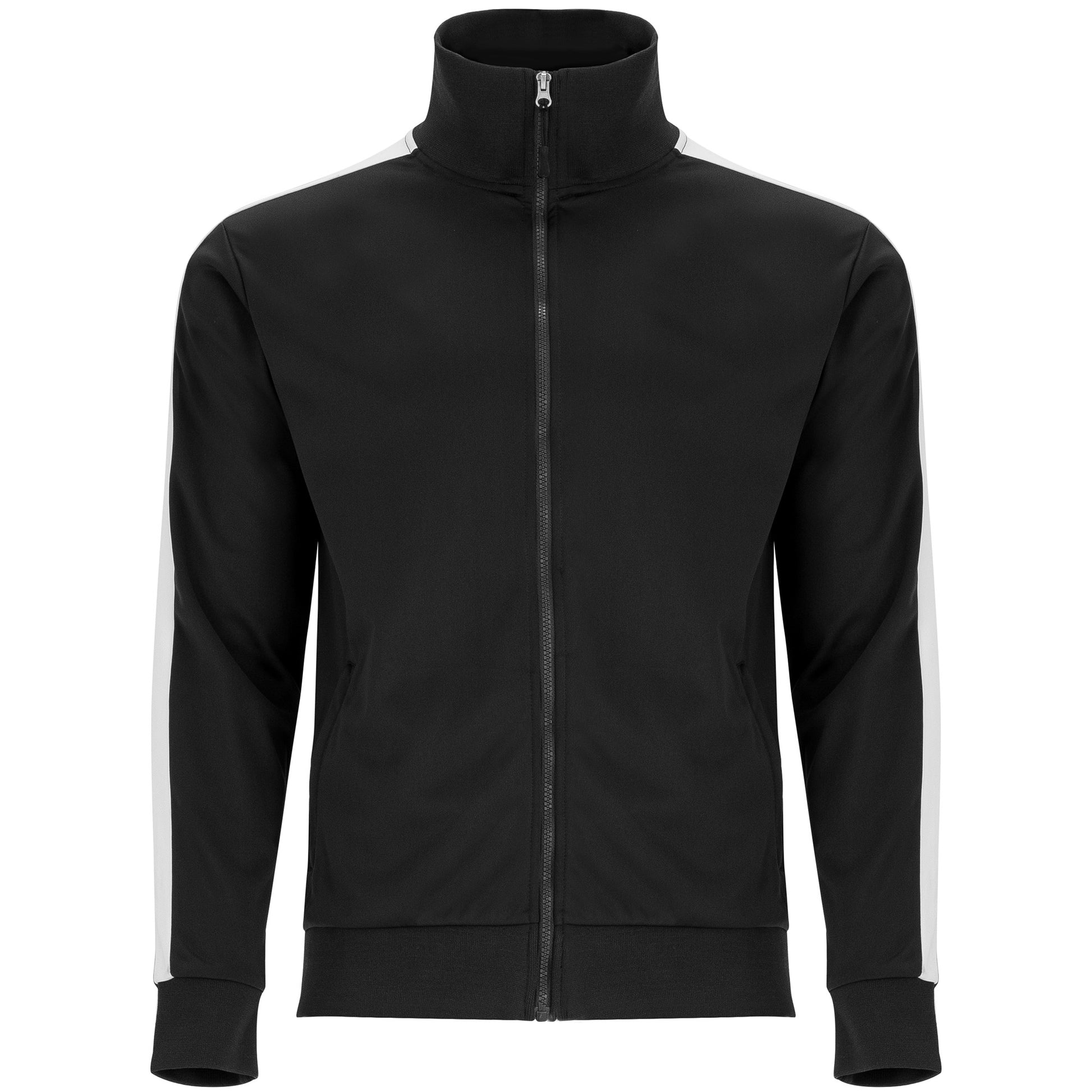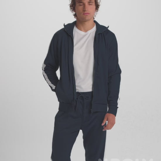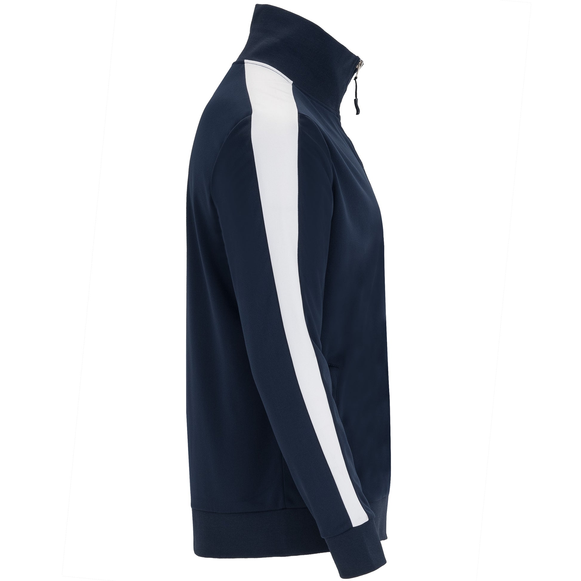 Chándal combinado de chaqueta y pantalón: Cuello alto con cubrecosturas interior a tono. Cremallera central a tono con tirador. Bolsillos laterales de chaqueta con cremalleras. Banda lateral a contraste. Pantalón con cintura elástica y cordón ajustable. Dos bolsillos laterales. Bolsillo trasero con cremallera. Bajo con puños elásticos en canalé 1×1.
