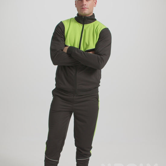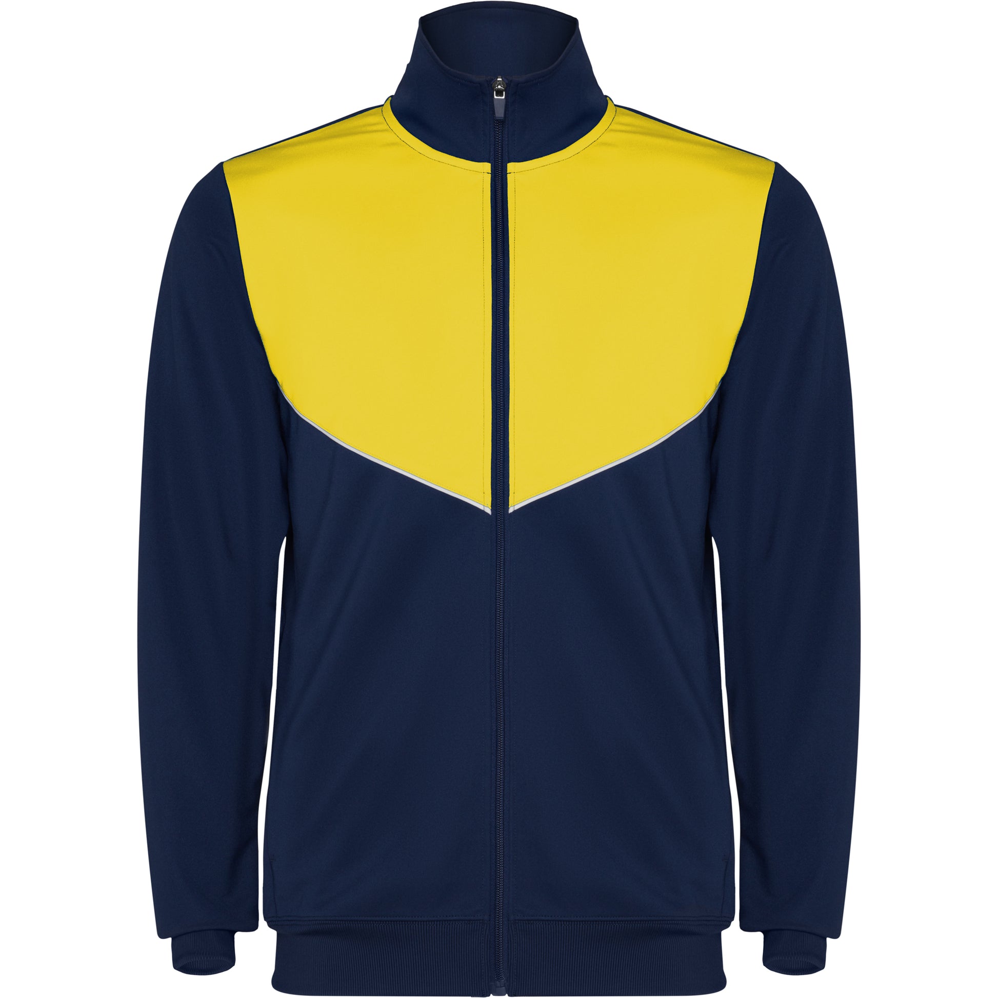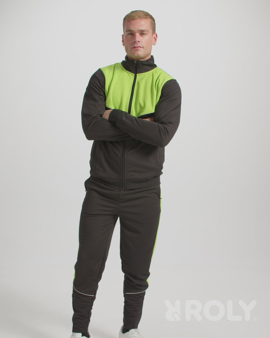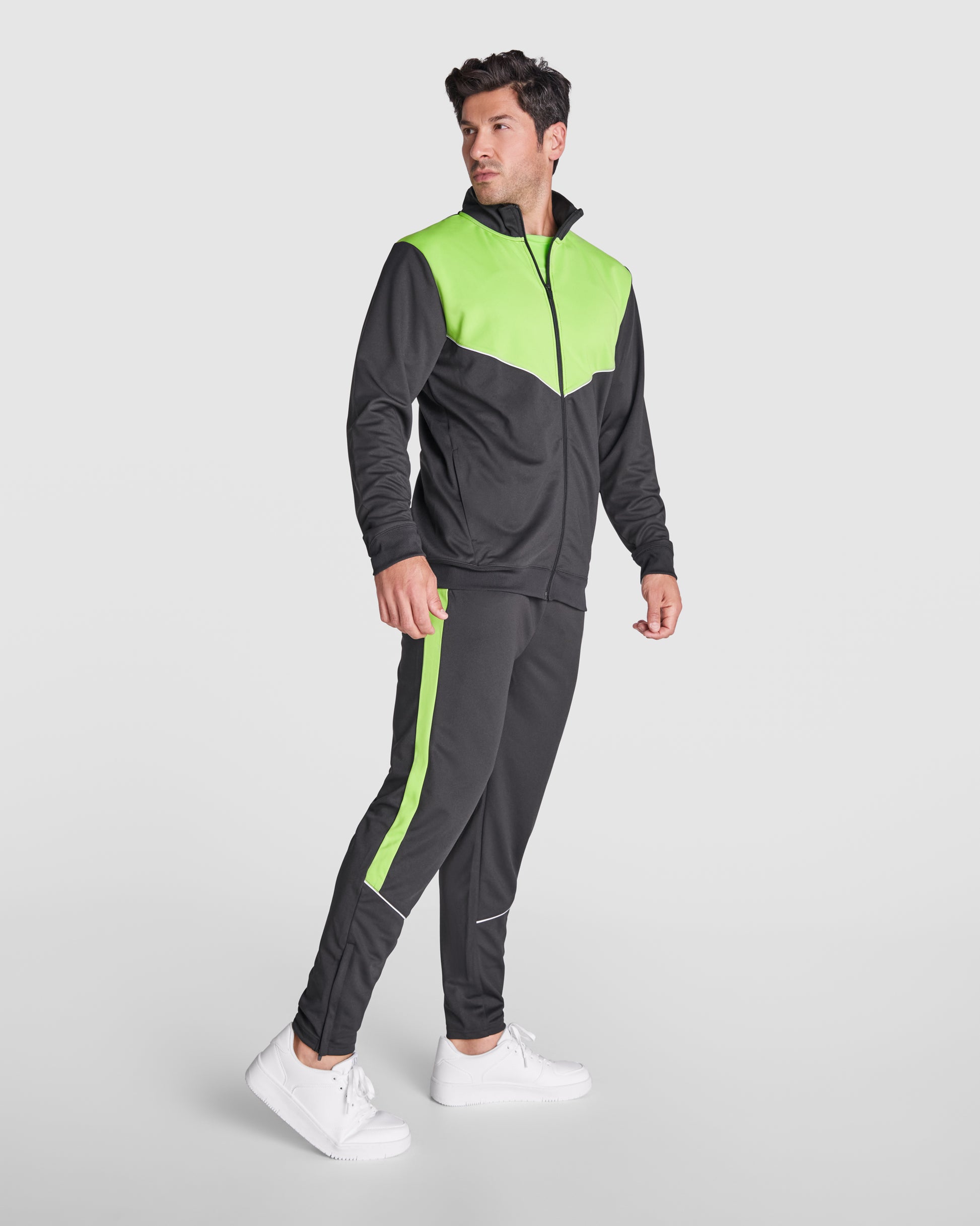 Chándal en tejido ligero y elástico.· Chaqueta con pecho a contraste de color y vivo.· Cuello alto con cubrecosturas a contraste.· Cremallera central· Bolsillos laterales.· Puños y cintura en canalé 2×2.· Pantalón con cintura elástica y cordón de ajuste. · Pieza lateral a contraste con vivo.· Bajo con cremallera.