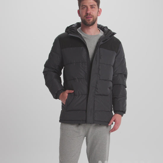 Chaqueta acolchada combinada con capucha fija. Cremallera frontal cubierta con una tapeta. Protector de barbilla. Dos bolsillos laterales con cremallera. Puños elásticos. Acceso interno para reprocesos en espalda y pecho izquierdo.