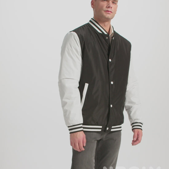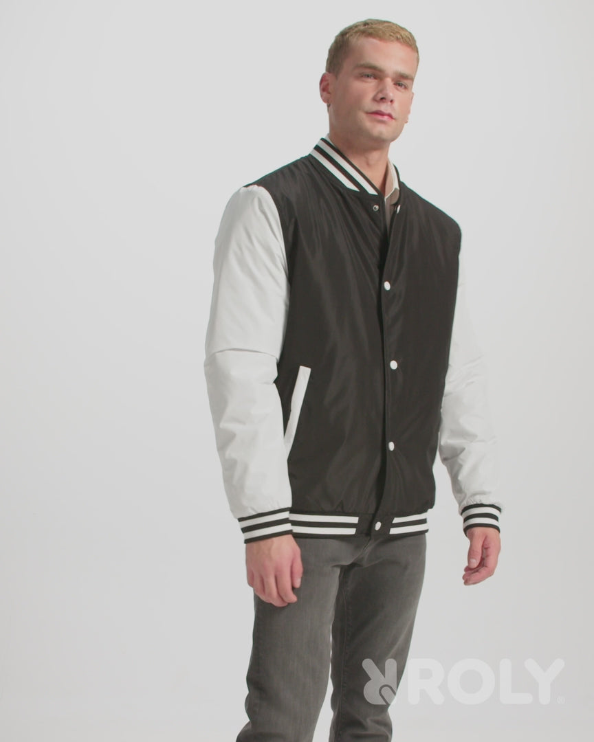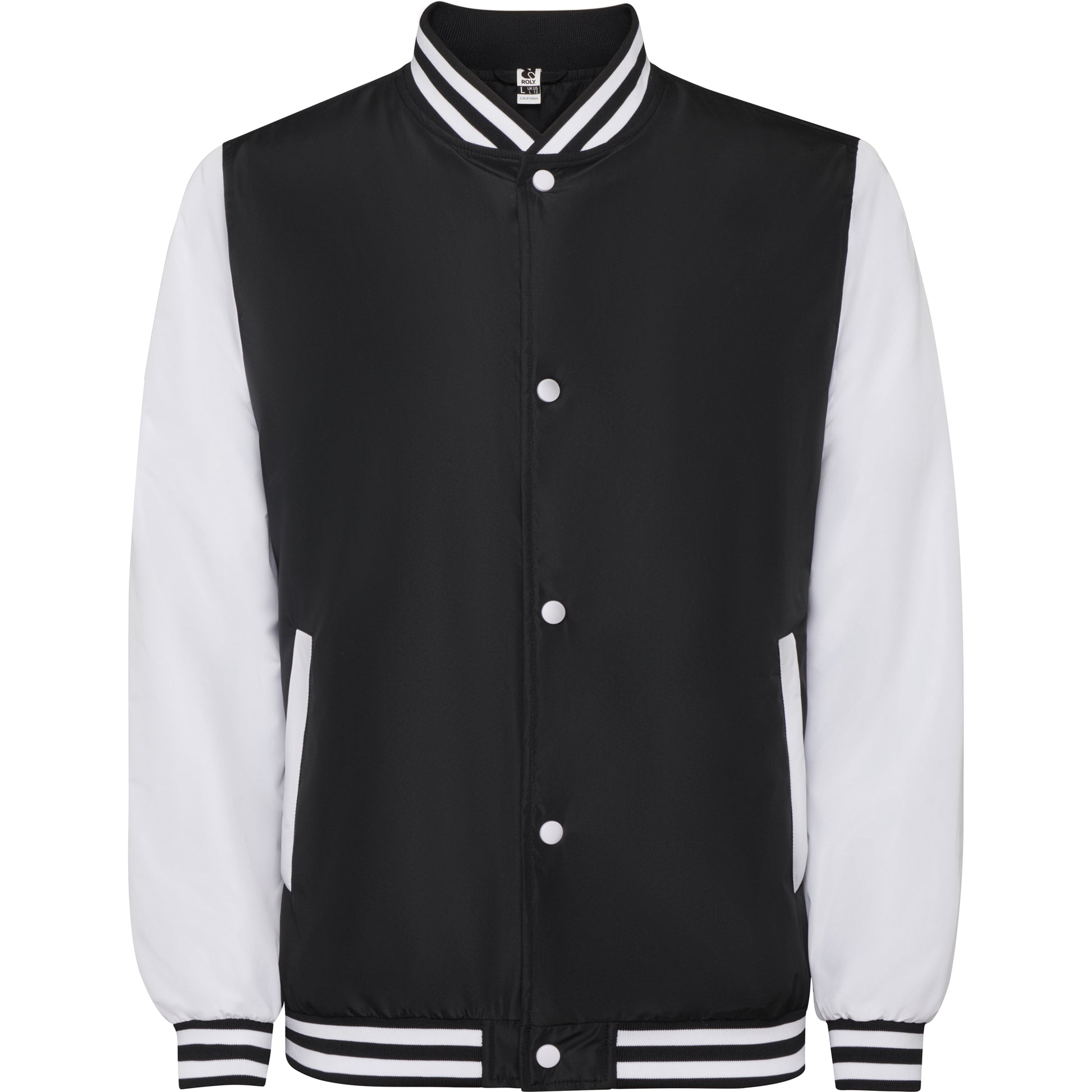 Chaqueta unisex ligeramente acolchada combinada con dos colores. Cuello, puños y bajo en rib 1×1, con dos líneas a contraste. Bolsillos laterales con cremallera. Interior forrado. Botones a presión con acabado de plástico a contraste. Acceso interior en pecho izquierdo y espalda para reprocesos.