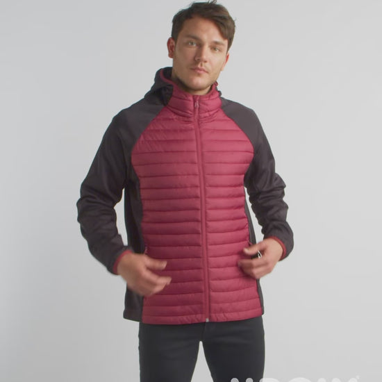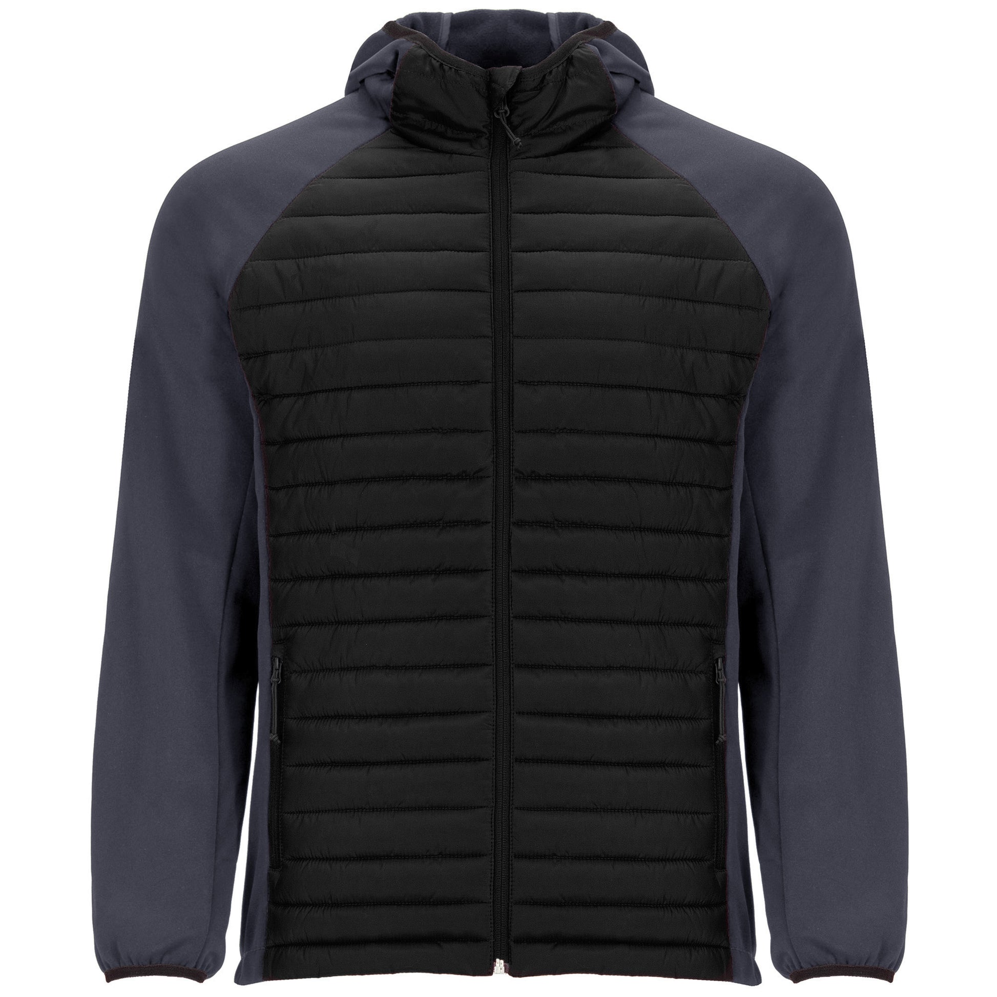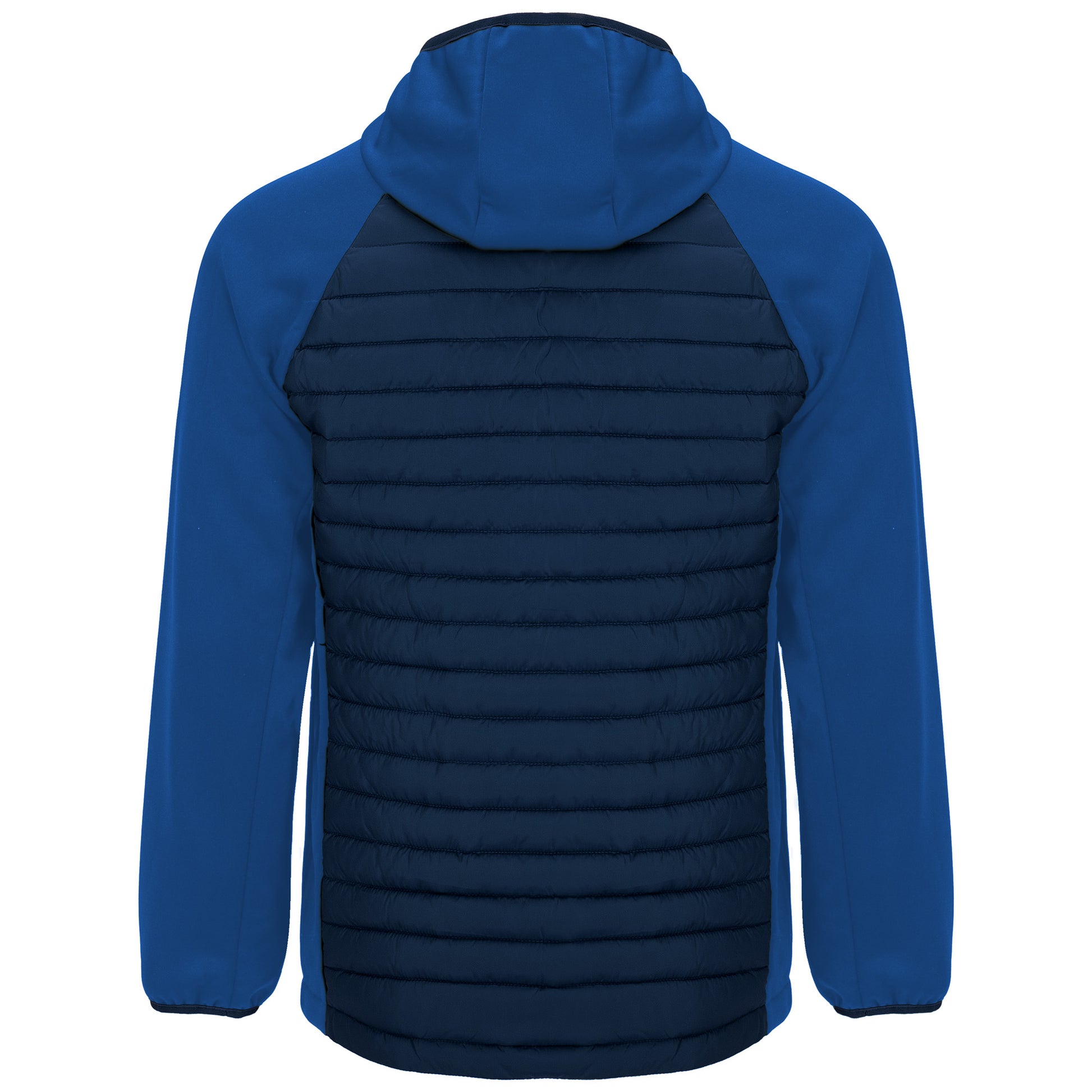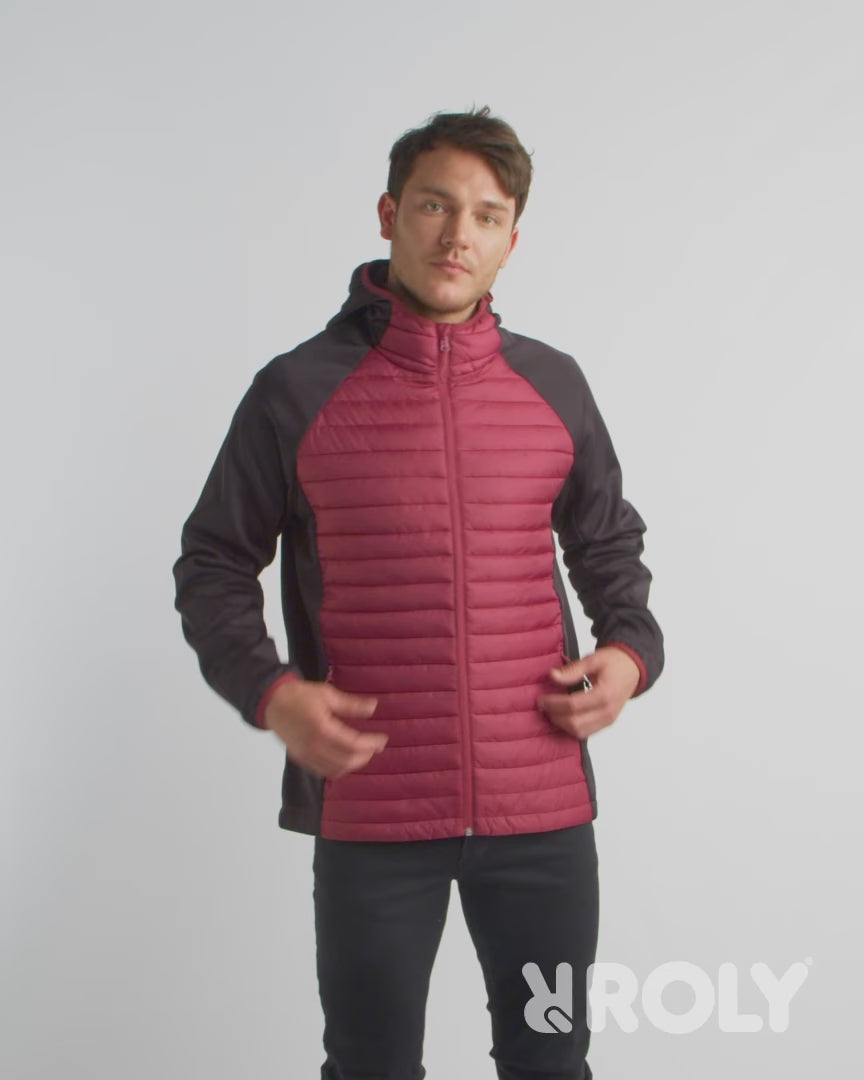 Chaqueta de hombre combinada en dos tejidos: Capucha fija ajustada. Manga estilo ranglán. Tejido softshell en mangas, paneles laterales y capucha, y tejido acolchado tacto pluma en frontal y espalda. Cremallera invertida a tono con protector de barbilla y tirador. Dos bolsillos frontales con cremalleras. Ribete elástico a tono en cuello, puños y bajo.