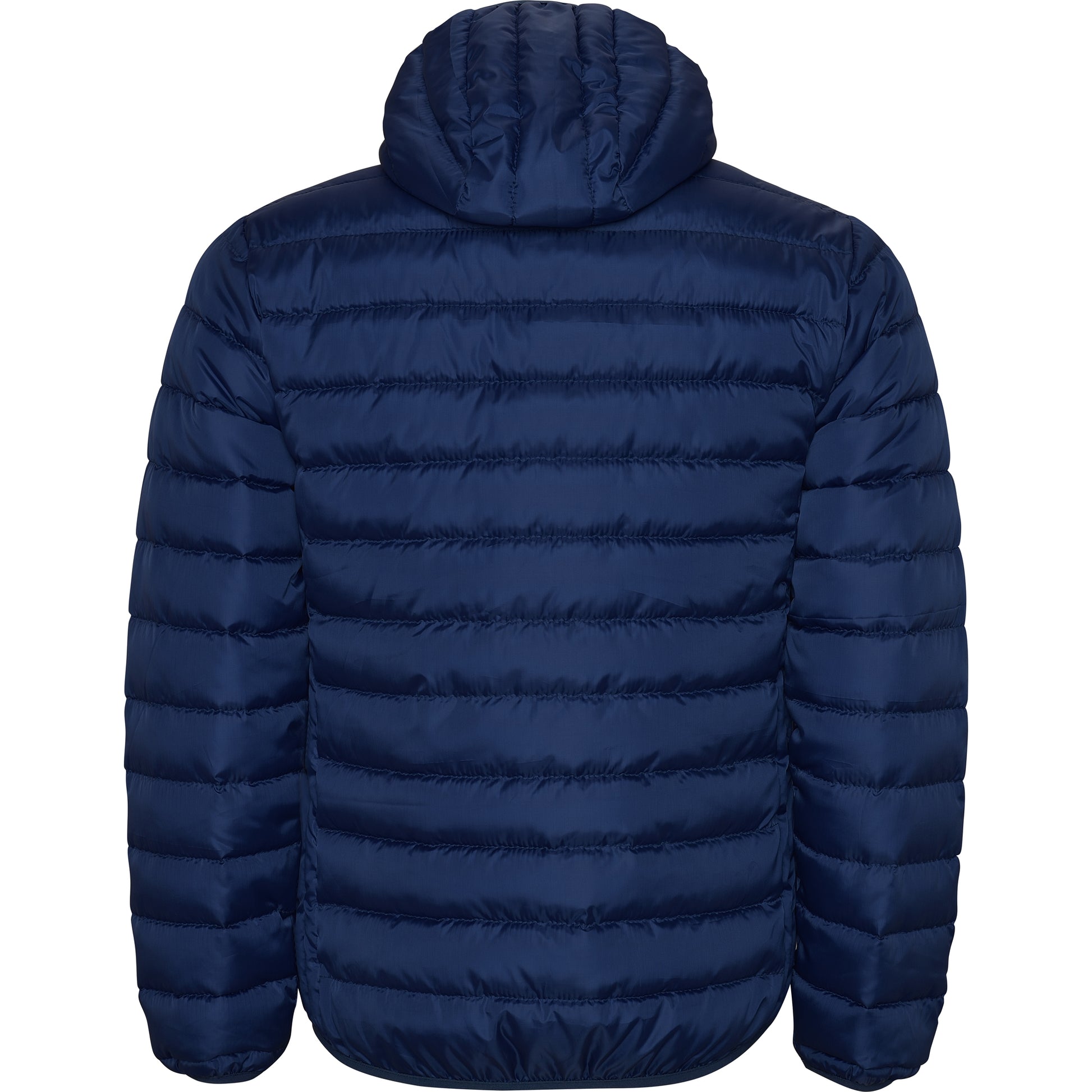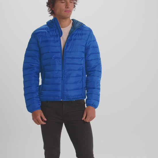 Chaqueta de hombre acolchada con relleno tacto pluma y capucha fija ajustada.