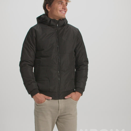 Chaqueta acolchada repelente al agua. Capucha extraíble con ajustadores. Cuello alto. Cremallera central a tono con protector de barbilla. Dos bolsillos laterales con cremallera. Punto canalé 2×1 en puños y cintura. Acceso para personalización en pecho izquierdo y espalda.