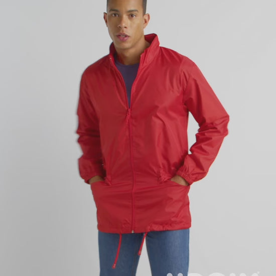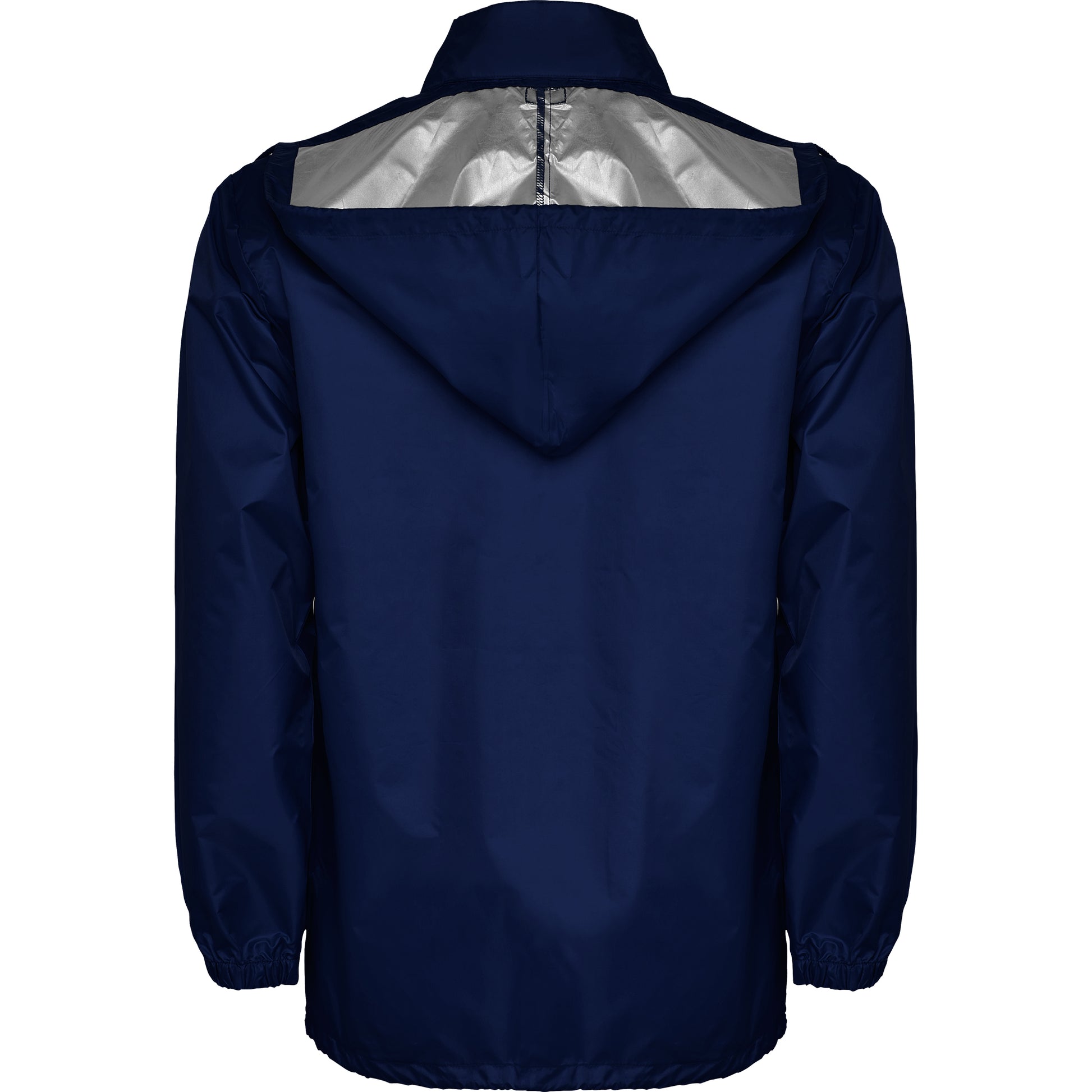 Chubasquero unisex. Cuello alto y capucha extraíble con cordones ajustables. Cremallera central al tono con tirador. Dos bolsillos laterales con solapa. Puños elásticos. Bajo con cordones ajustables en interior. Goma elástica en el interior del bolsillo para su plegado y guardado.