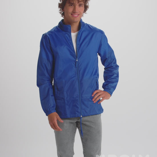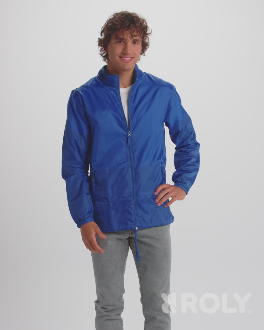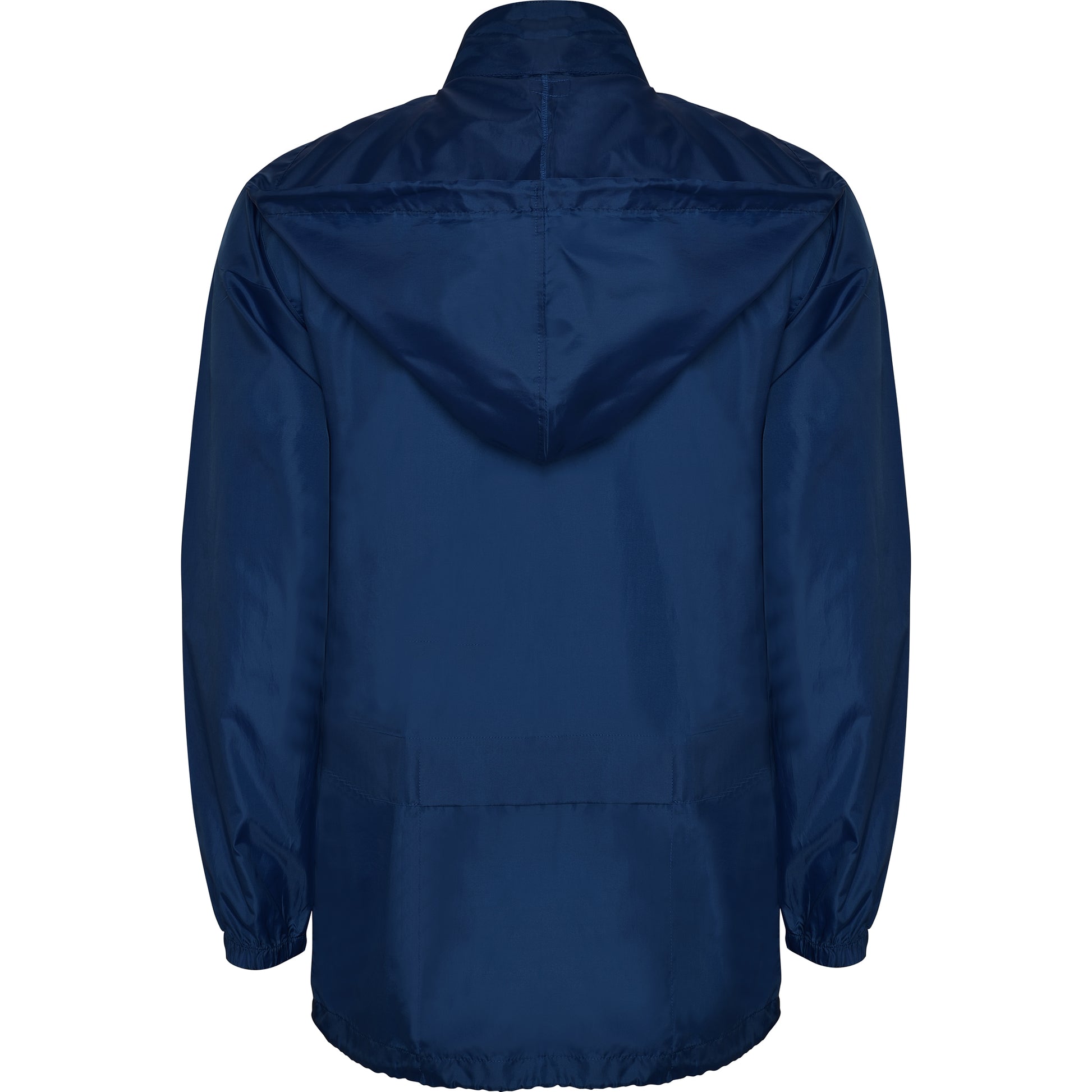 Chubasquero unisex. Cuello alto y capucha extraíble con cordones ajustables. Cremallera central al tono con tirador. Dos bolsillos laterales de cremallera con solapa. Puños elásticos. Bajo con cordones ajustables en interior. Goma elástica en el interior del bolsillo para su plegado y guardado.
