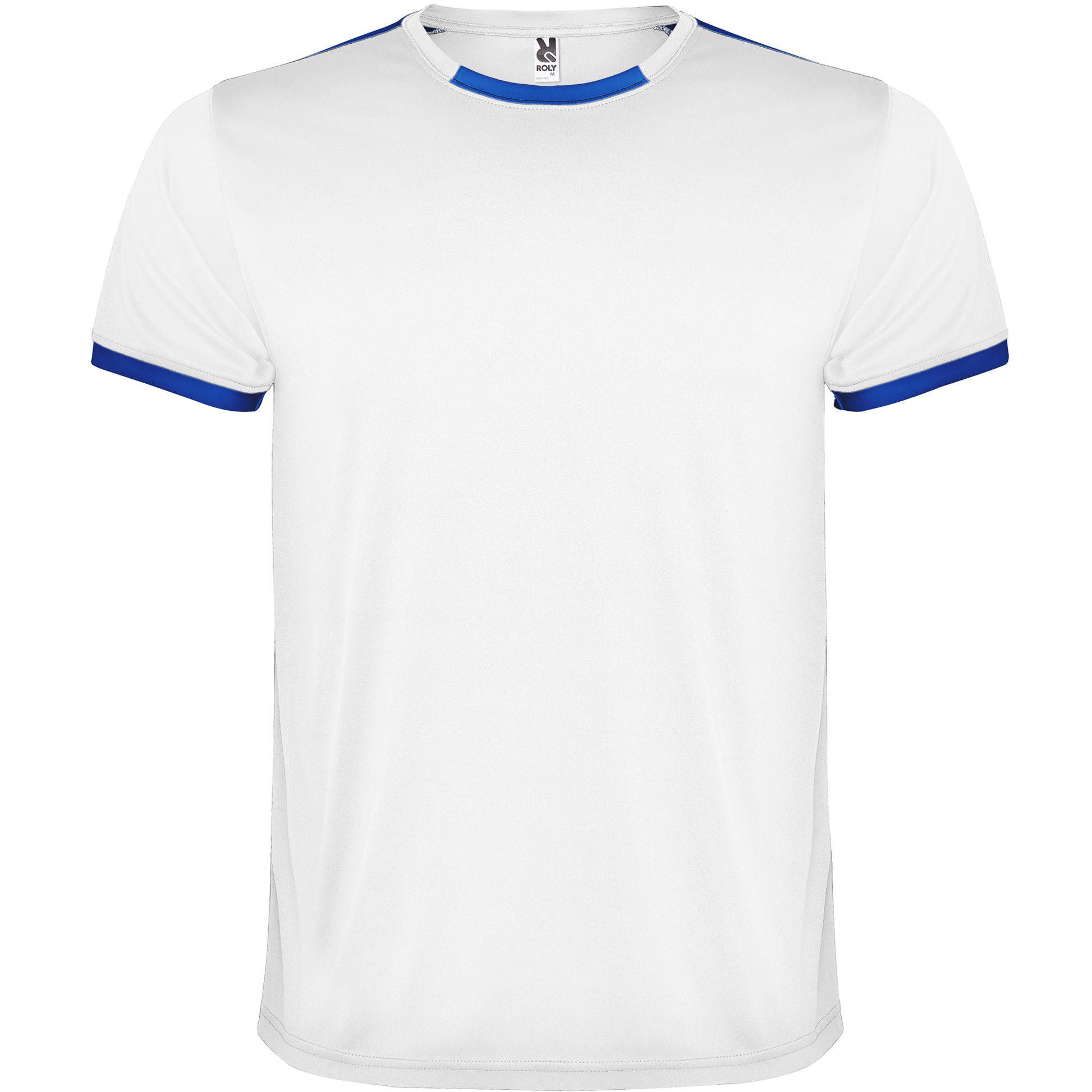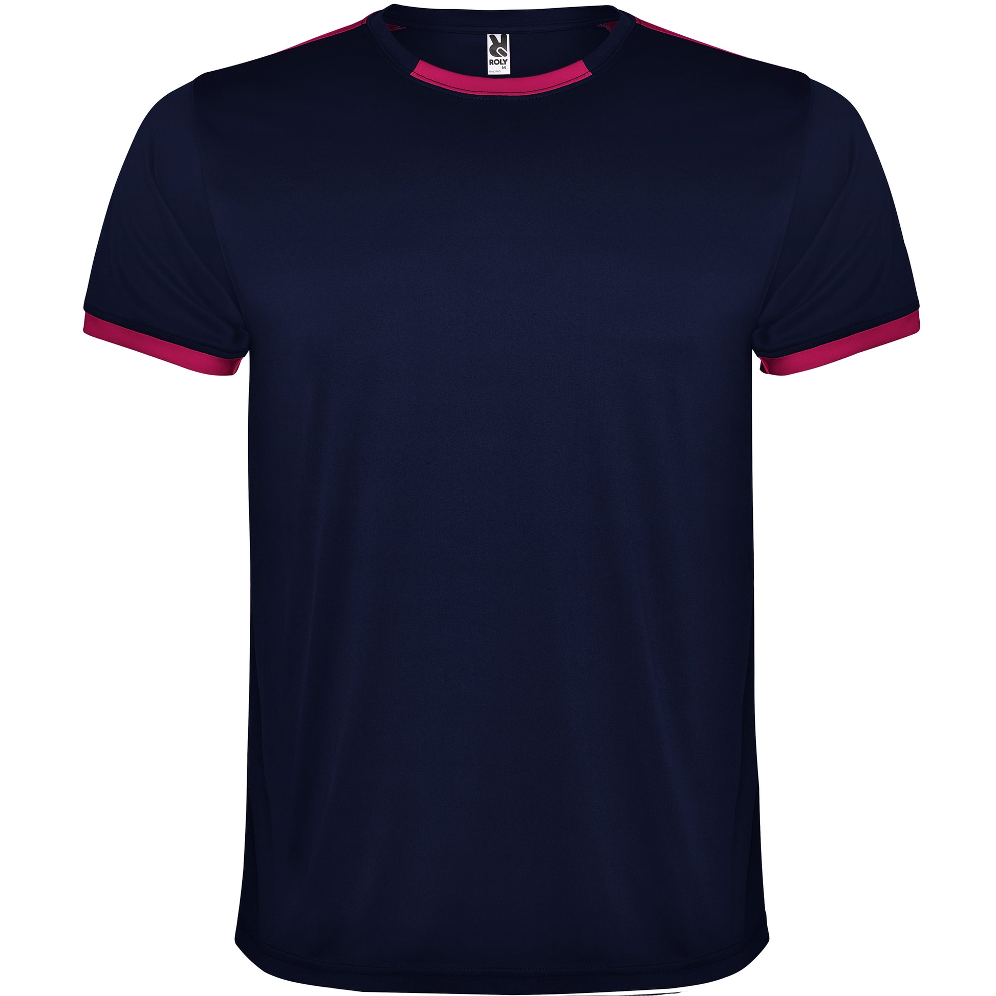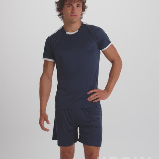 Conjunto deportivo unisex compuesto de 2 camisetas + 1 pantalón. Manga corta con vivo ancho en contraste. El color de la segunda camiseta se compone de manera contraria. Cuello redondo con ribete bicolor y con cubrecosturas reforzado en su interior. Pantalón con cinturilla elástica con cordón interior al tono con pespunte de seguridad.