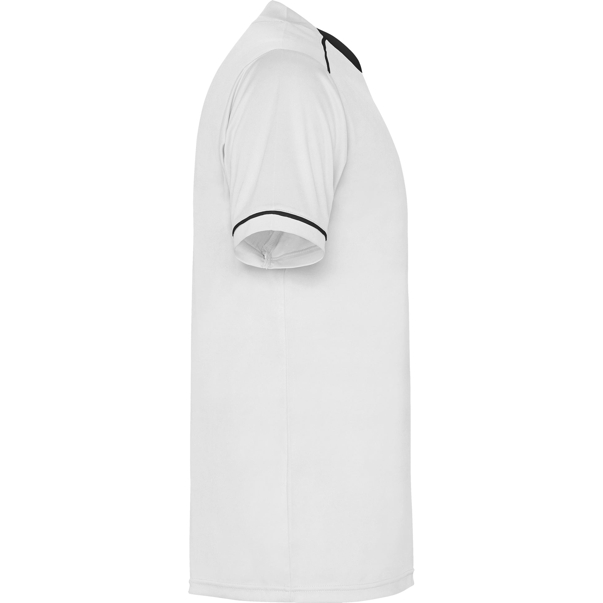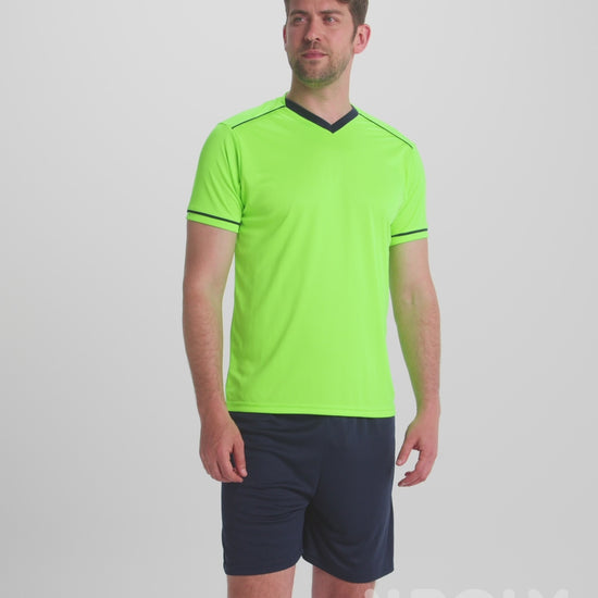 Conjunto deportivo de camiseta y pantalón. Camiseta con doble cuello de fantasía con acabado en pico con cubrecosturas reforzado en el interior. Hombro con adorno de ribete en contraste. Manga corta con apertura acabada en vivo y con ribete de adorno en contraste. Pantalón corto con cintura elástica con ajuste de cordón en su interior y pespunte de seguridad.