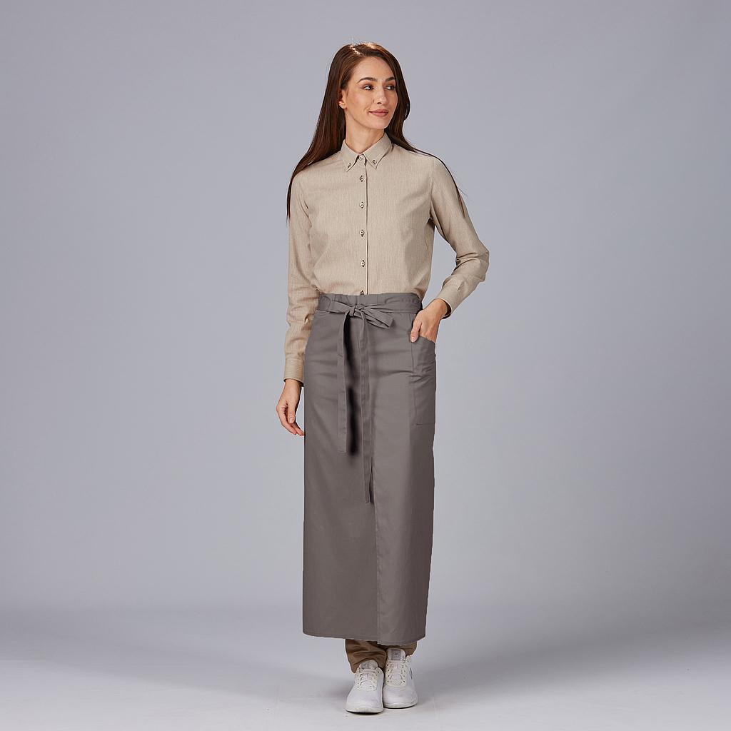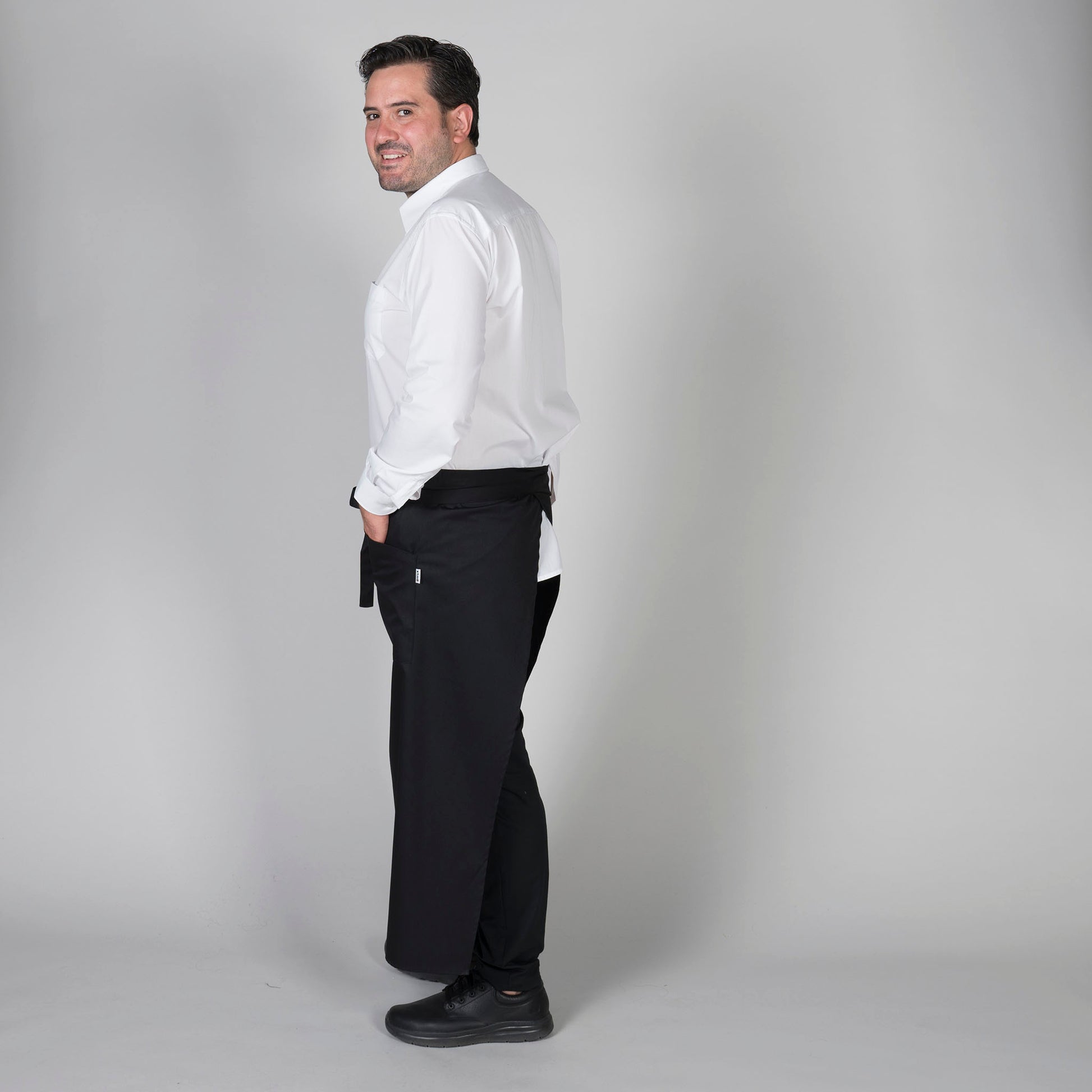 Delantal unisex con bolsillo lateral y abertura central. Es talla única y su medida es de 90x110 cm. Es resistente a las salpicaduras de lejía y de tejido ligero.
