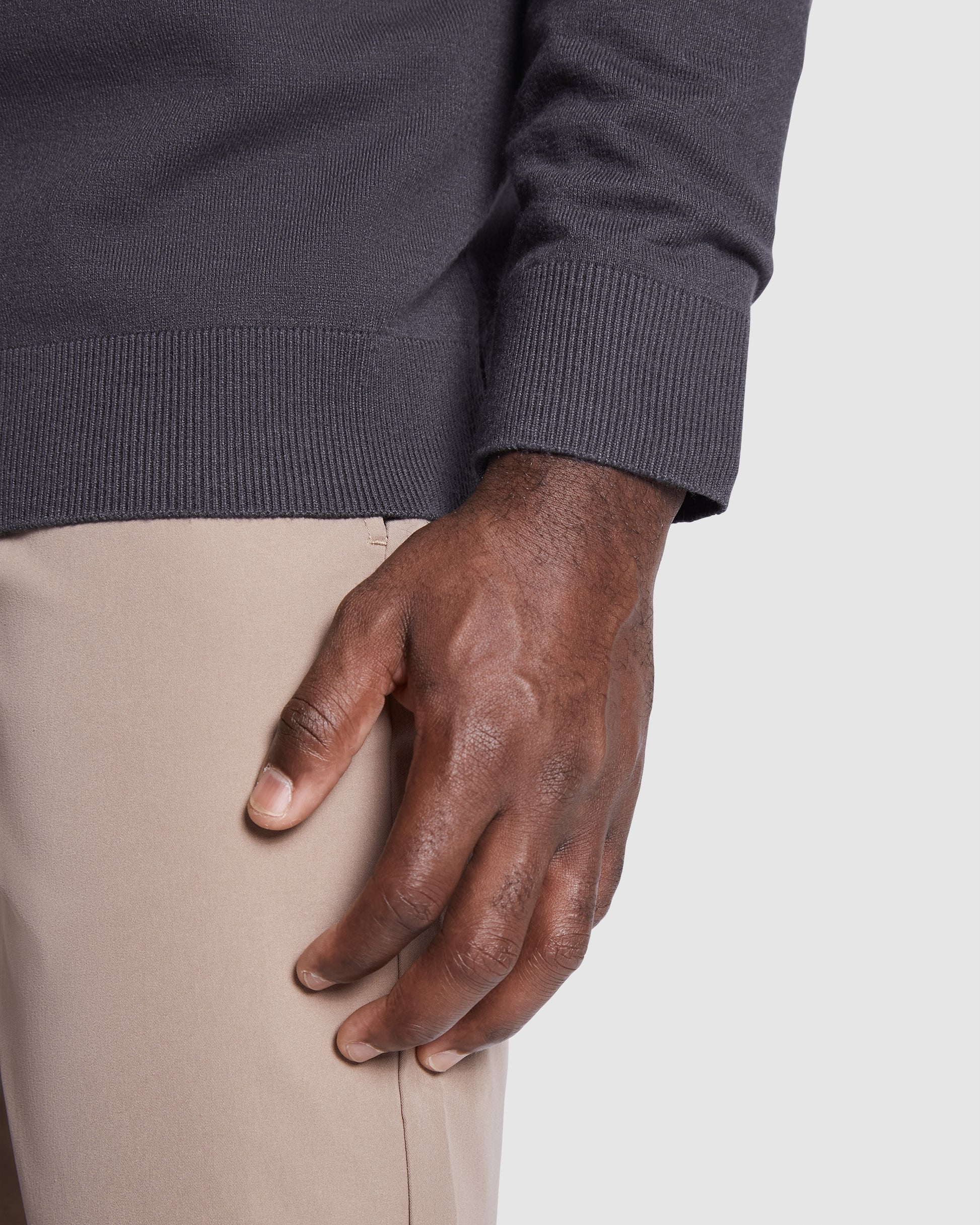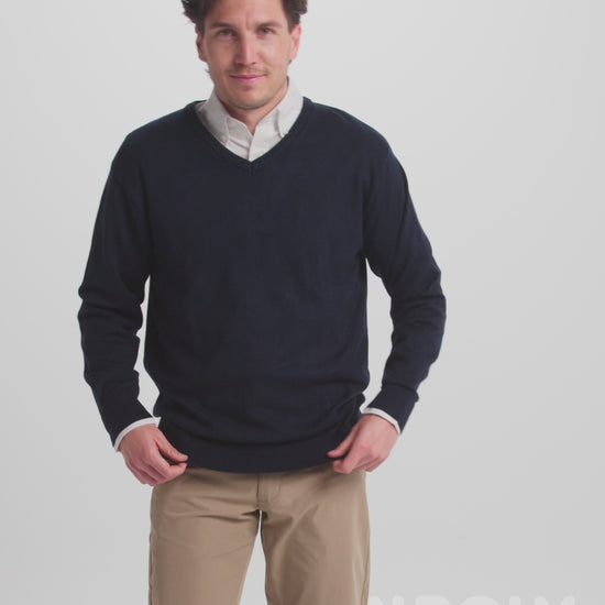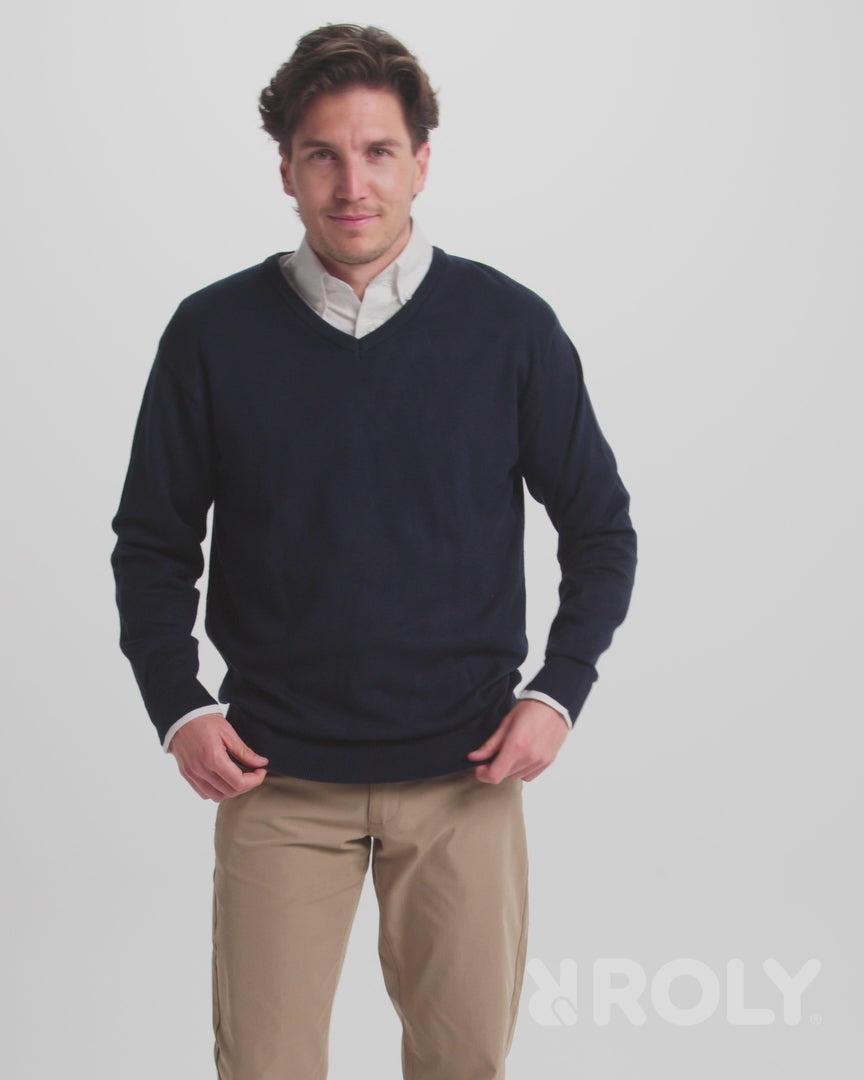 Jersey para hombre con escote de pico en punto fino. Acabado en punto de canalé 1×1 al tono en escote, puños y bajo.