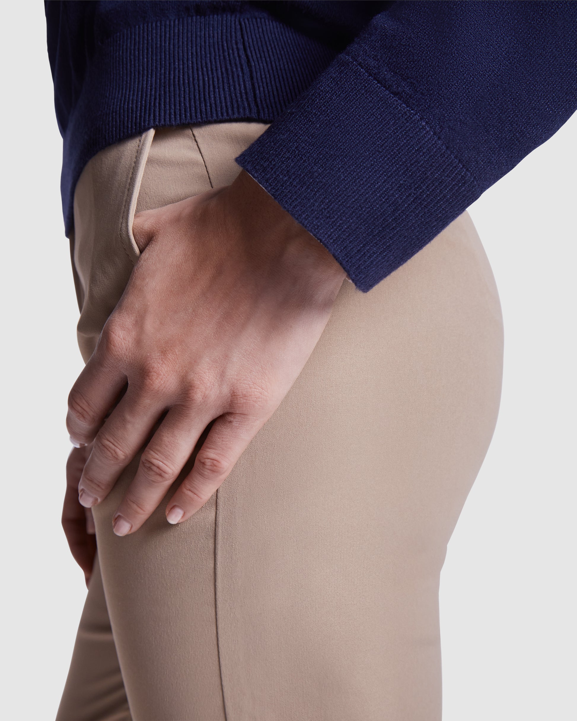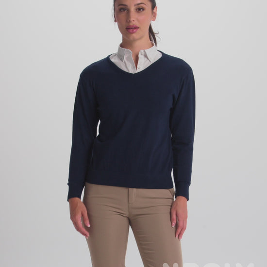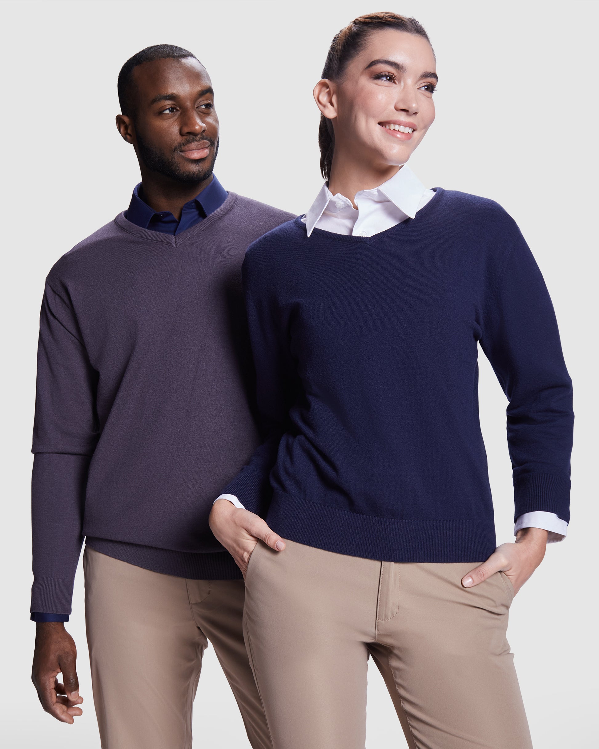 Jersey de mujer con escote de pico en punto fino. Acabado en punto de canalé 1×1 al tono en escote, puños y bajo.