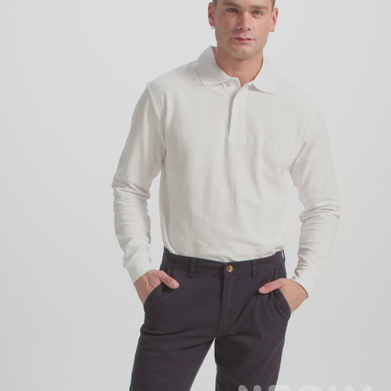 Pantalón largo de hombre con tejido resistente y confortable. Trabillas para cinturón. Dos bolsillos laterales de corte oblicuo tipo “chino”. Dos bolsillos traseros de ojal con botón y costura de adorno. Pinzas traseras. Especial para hostelería y ámbito laboral.