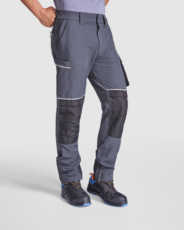 - Bolsillo para rodilleras con tapeta fija, cinta reflectante y cierre de velcro.