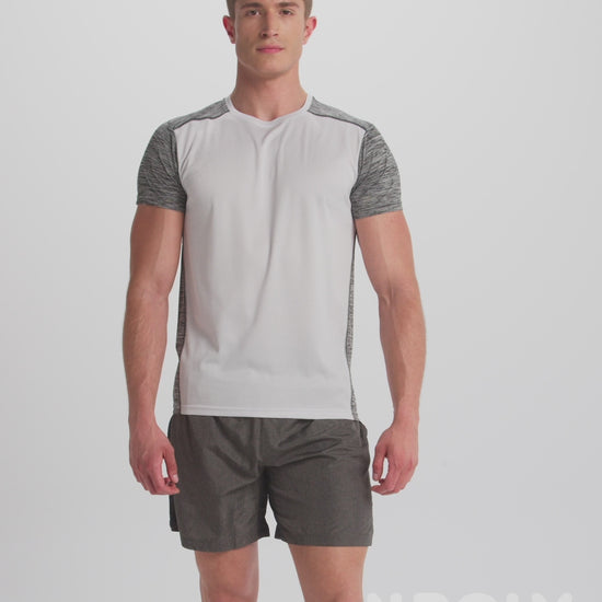 Bermuda con dos tejidos y slip interior. Cinturilla elástica con cordón interior cruzado a contraste. Banda lateral e interior de la pierna en tejido transpirable. Dos bolsillos laterales. Apertura lateral en el bajo con forma asimétrica.