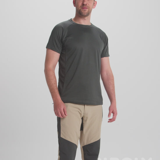 Pantalón Unisex de Trekking combinado en tres tejidos. Cintura elástica en los laterales. Trabillas para cinturón. Dos bolsillos laterales con cremalleras invertidas. Bolsillo trasero derecho con cremalleras invertidas. Tejido strech en piezas frontales y trasero que permiten una gran libertad de movimiento.