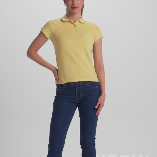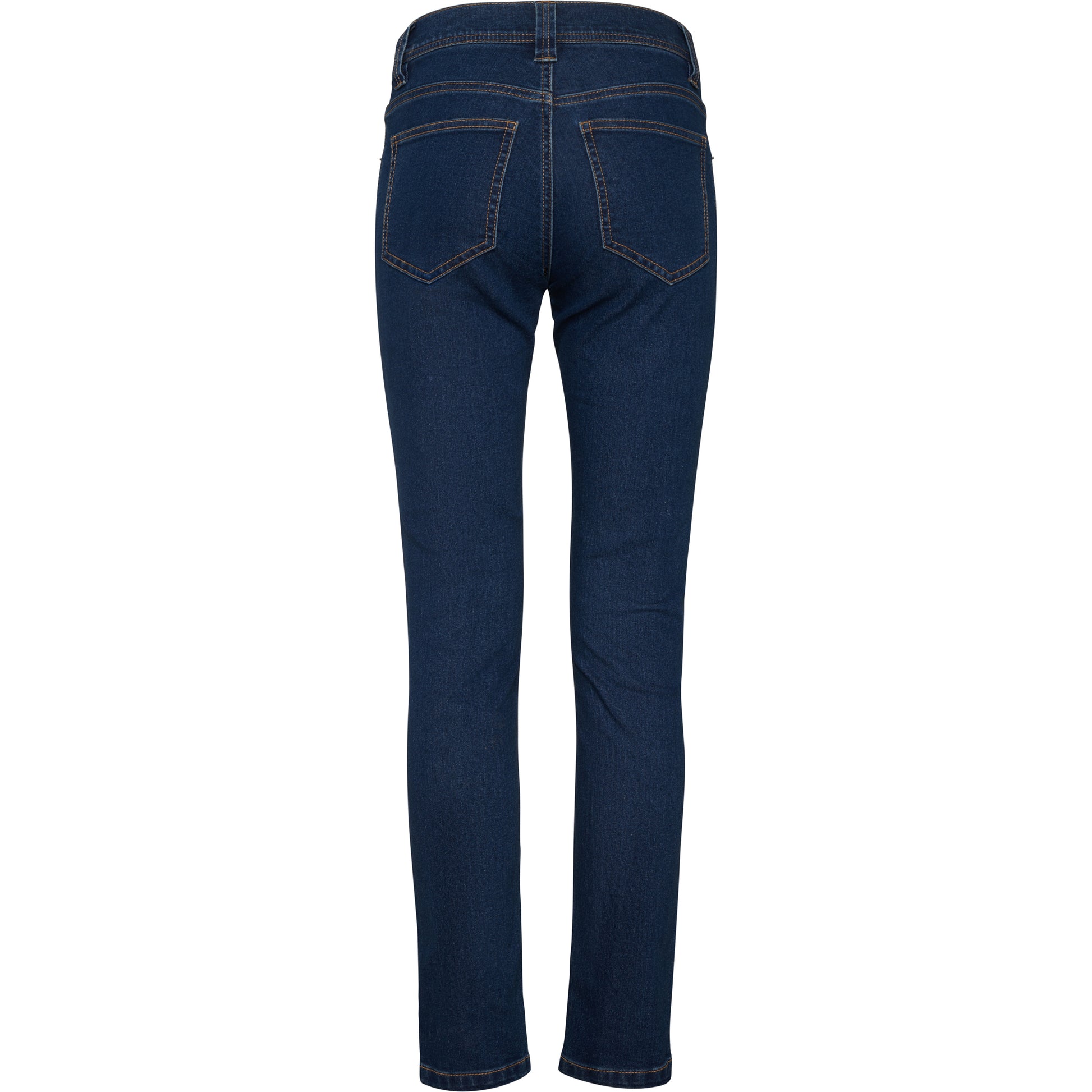 Pantalón vaquero de mujer. De corte regular fit y tiro medio. Cinturilla con 5 trabillas. Bragueta con cremallera metálica. Dos bolsillos frontales y bolsillo portamonedas. Dos bolsillos traseros. Corte semientallado en tejido elástico.