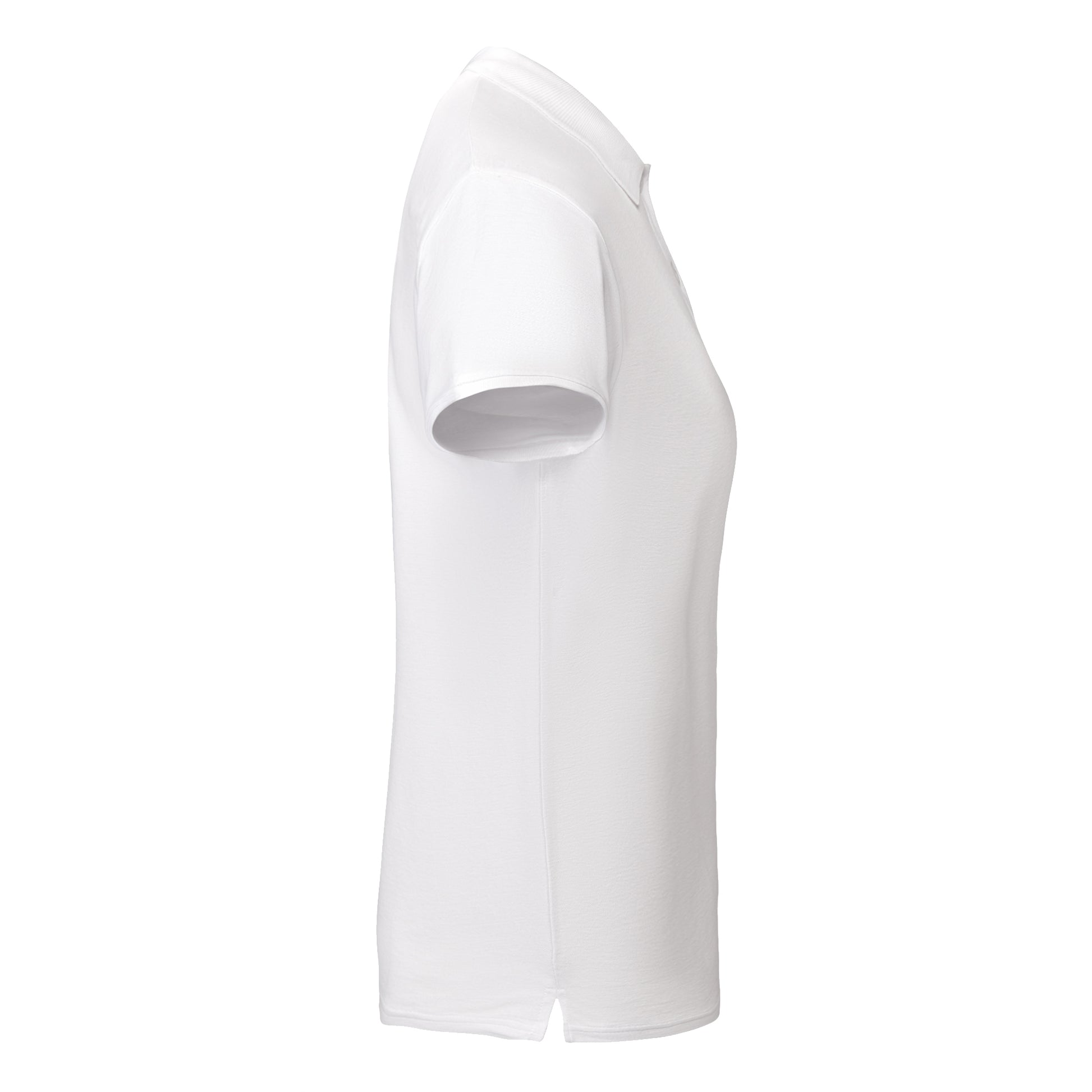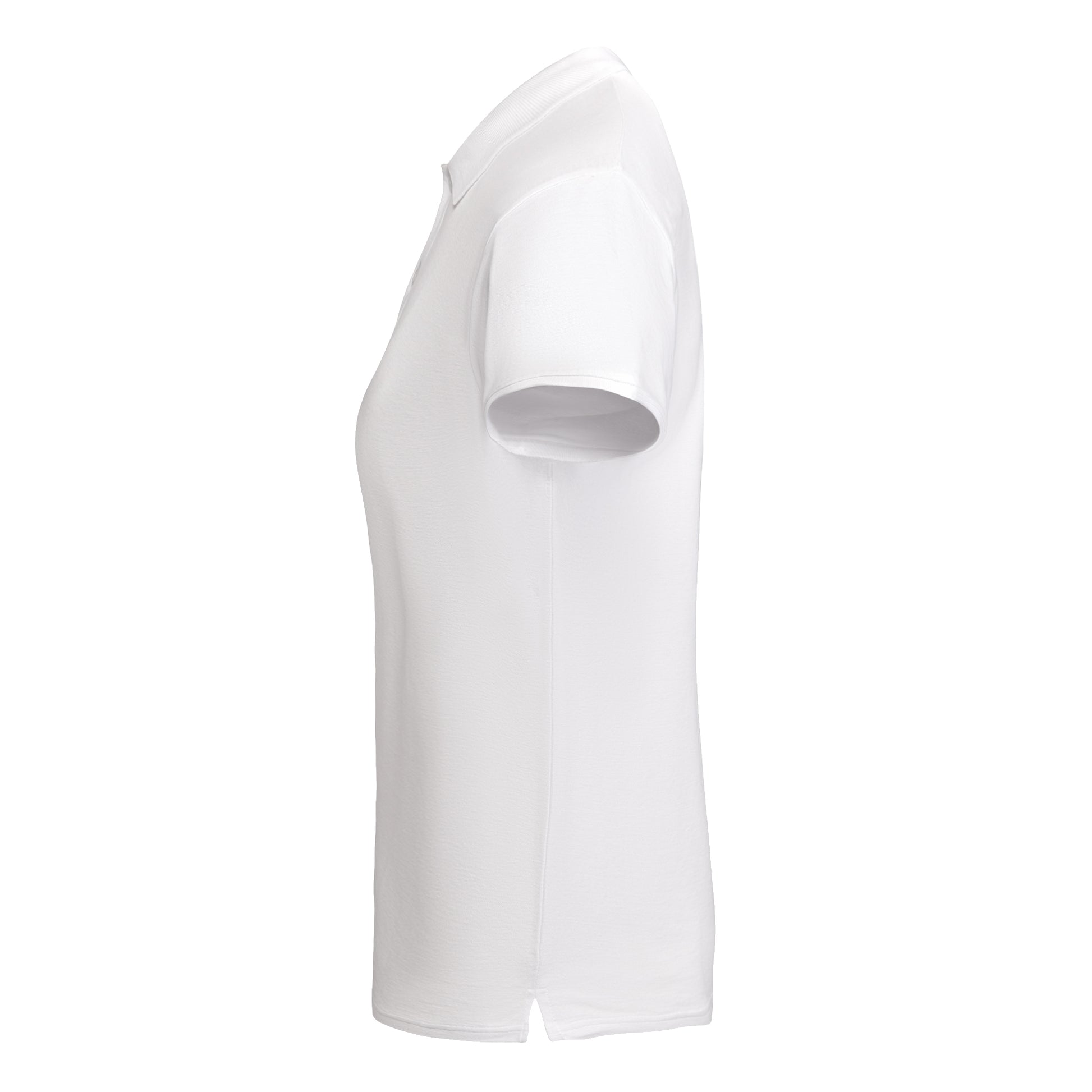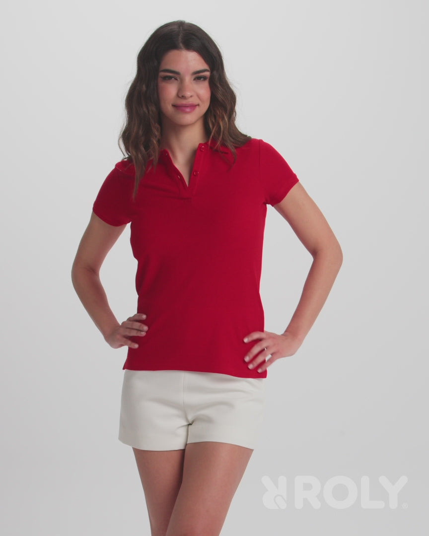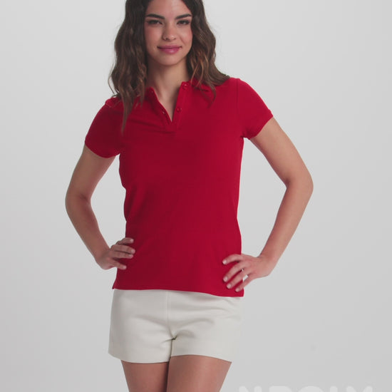Polo de mujer entallado de manga corta en algodón orgánico certificado OCS. Cuello y ribete de mangas en canalé 1×1. Tapeta con 2 botones. Cubrecosturas reforzado en cuello. Aperturas laterales en el bajo.