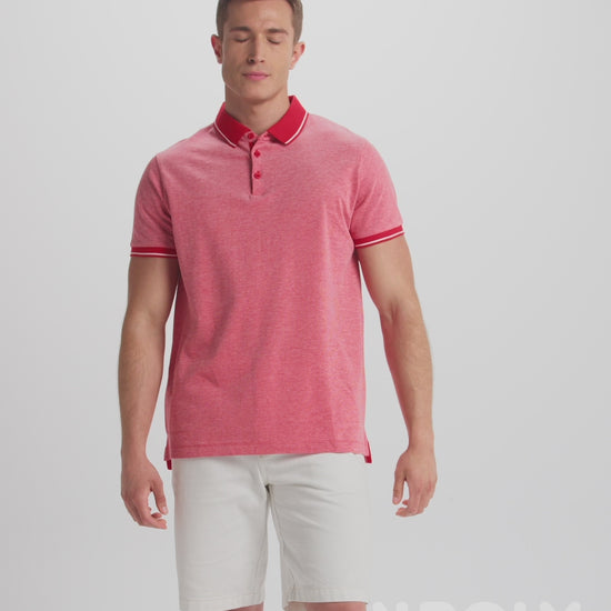 Polo Vigoré de manga corta. Cuello y bocamangas en color solido con canalé 1×1 y detalle decorativo a contraste. Tapeta interior con cinta decorativa a contraste y tres botones. Bajo con apertura lateral reforzada y cinta decorativa. Espalda ligeramente más larga que el delantero.
