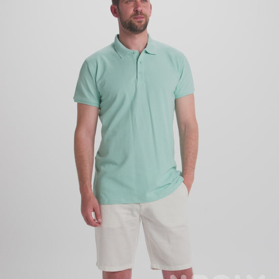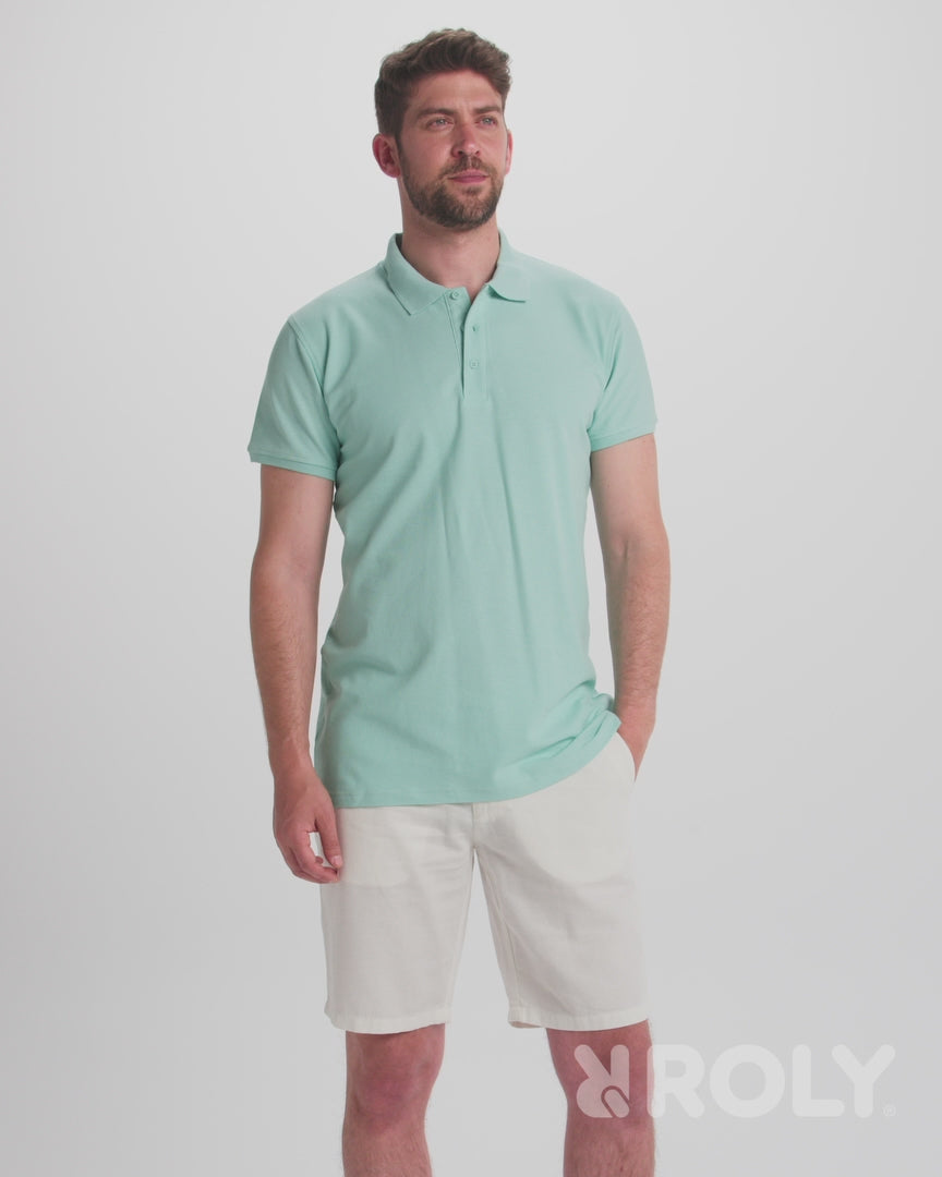 Polo de hombre de manga corta. Cubrecosturas reforzado en el interior del cuello. Ribete de manga y cuello acanalado. Costuras laterales. Tapeta con tres botones. Aperturas en los laterales del bajo.