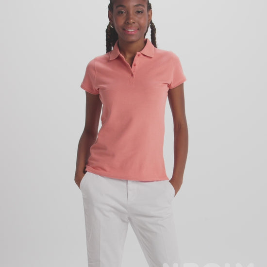 Polo de mujer de manga corta. Cubrecosturas reforzado en el interior del cuello. Cuello y ribete de manga acanalado. Costuras laterales y corte ajustado. Tapeta fina con tres botones. Aperturas en los laterales del bajo.