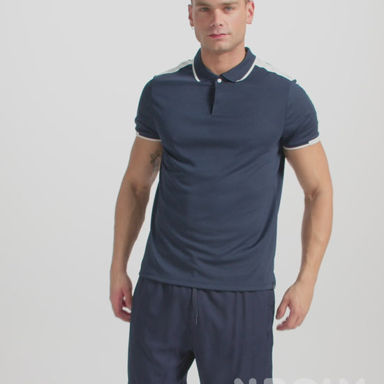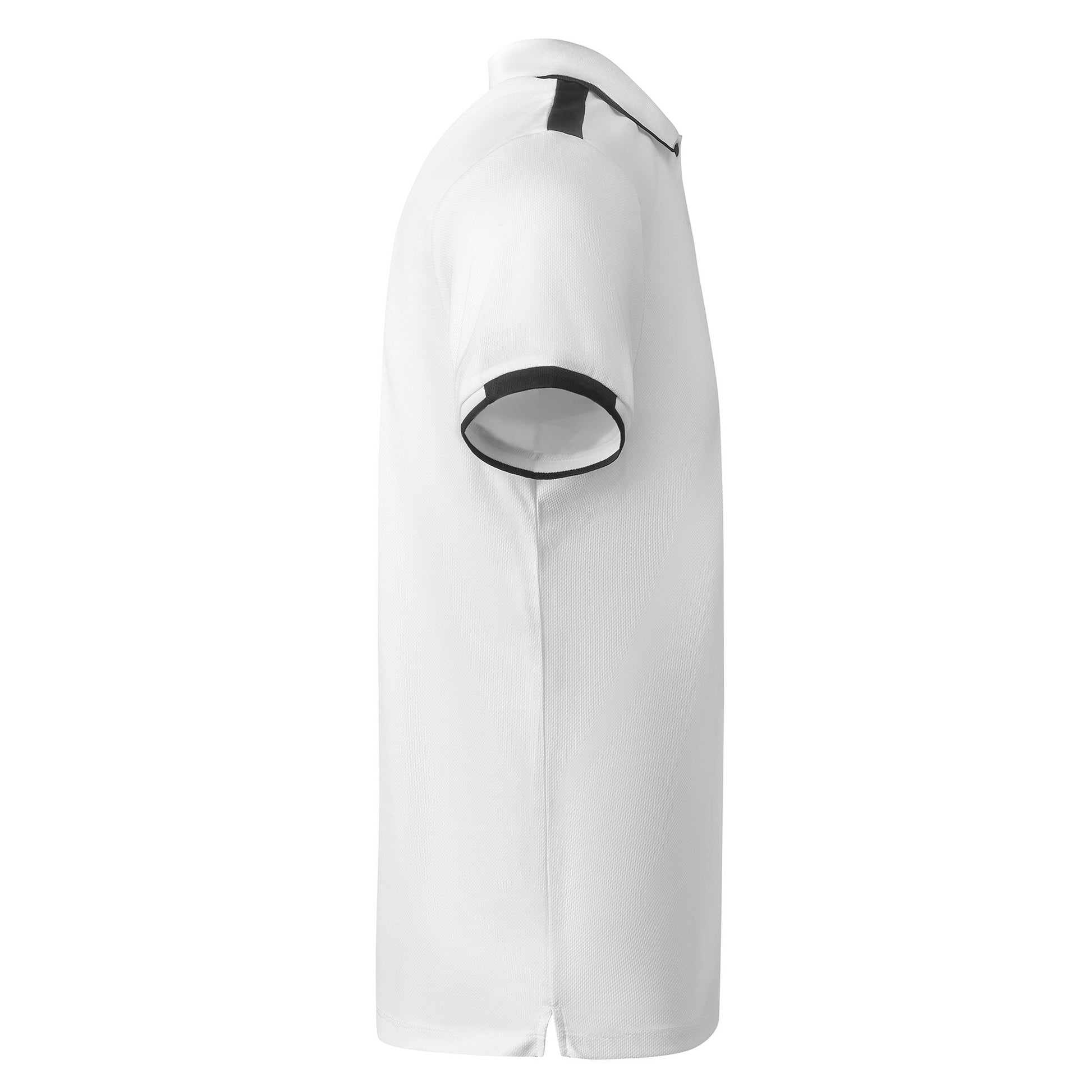 Polo técnico de manga corta para hombre en poliéster reciclado antibacteriano. Cuello y detalle ribete de mangas en canalé 1×1. Cubrecosturas reforzado en cuello. Tapeta con 2 botones automáticos ocultos. Piezas de hombros y detalles a contraste. Aperturas laterales en el bajo.