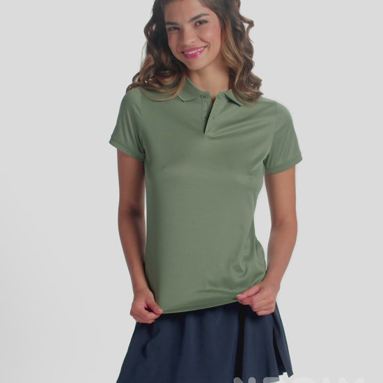 Polo técnico entallado de manga corta para mujer. Cuello de poliester rib 1×1 con corchetes de plastico a tono con la tapeta. Cubrecosturas a tono. Manga con acabado rib 1×1 al tono.
