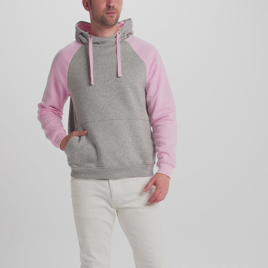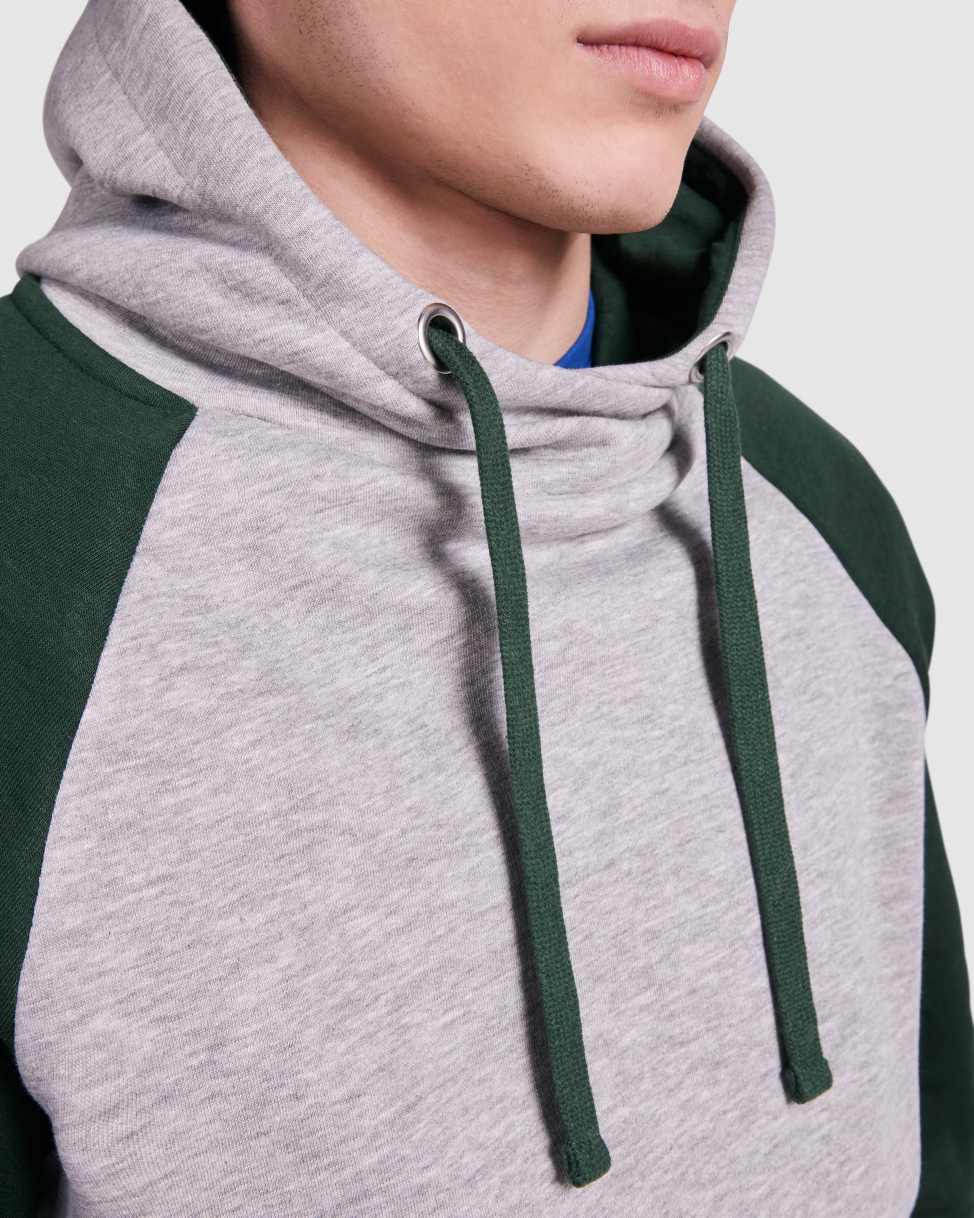 Sudadera bicolor unisex. Capucha con cuello cruzado y ojales metálicos, interior y cordones a contraste. Manga estilo ranglán a contraste. Bolsillo canguro. Puños y bajo con punto canalé con elastano 1×1.