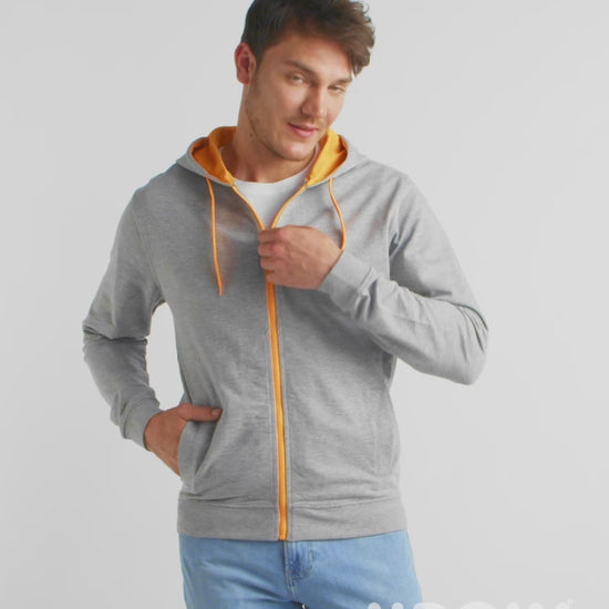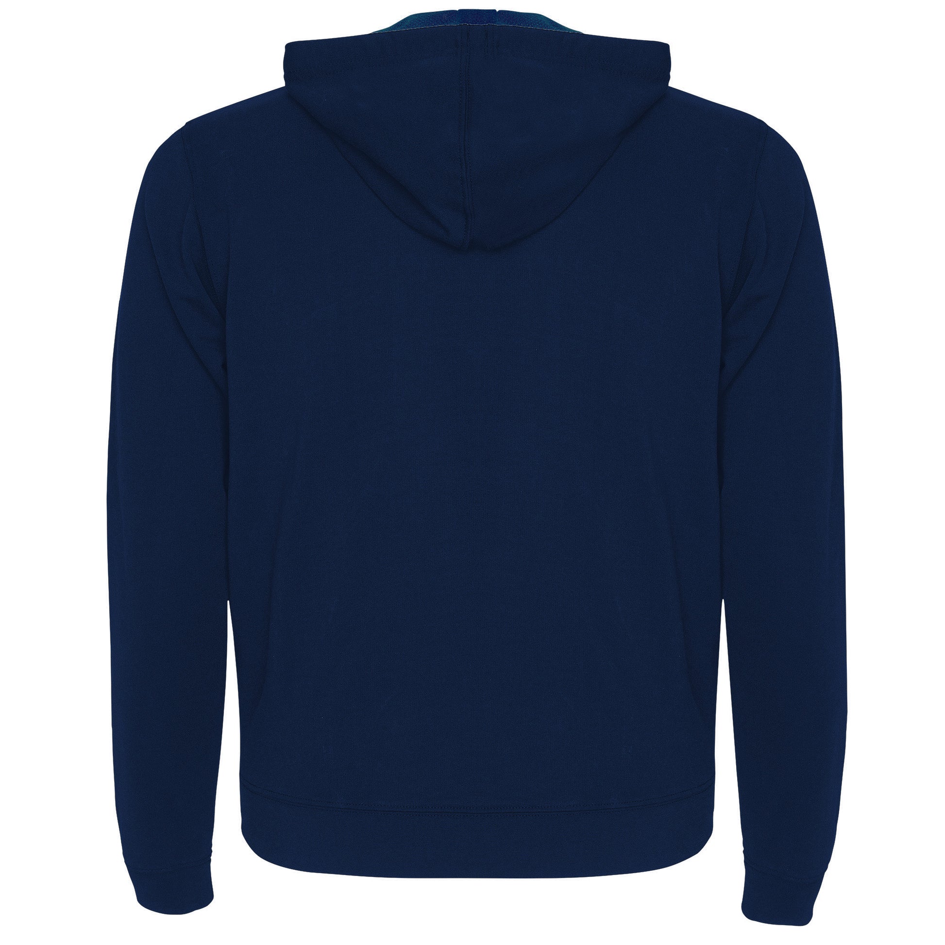 Sudadera de felpa no perchada con detalles en color flúor. Cremallera central con tirador en contraste color flúor. Capucha con forro interior en tejido de poliéster microperforado en contraste color flúor, con cordón y ojales metálicos en contraste color flúor. Manga larga con puño y cintura en punto canalé 1×1. Dos bolsillos frontales con vivo ancho. Cubrecosturas reforzado en el interior del cuello.