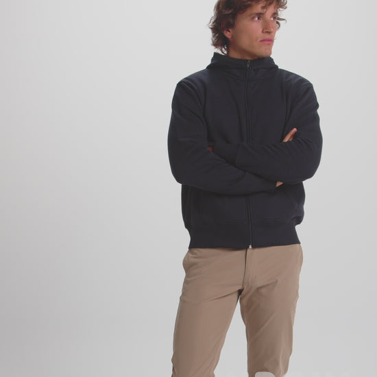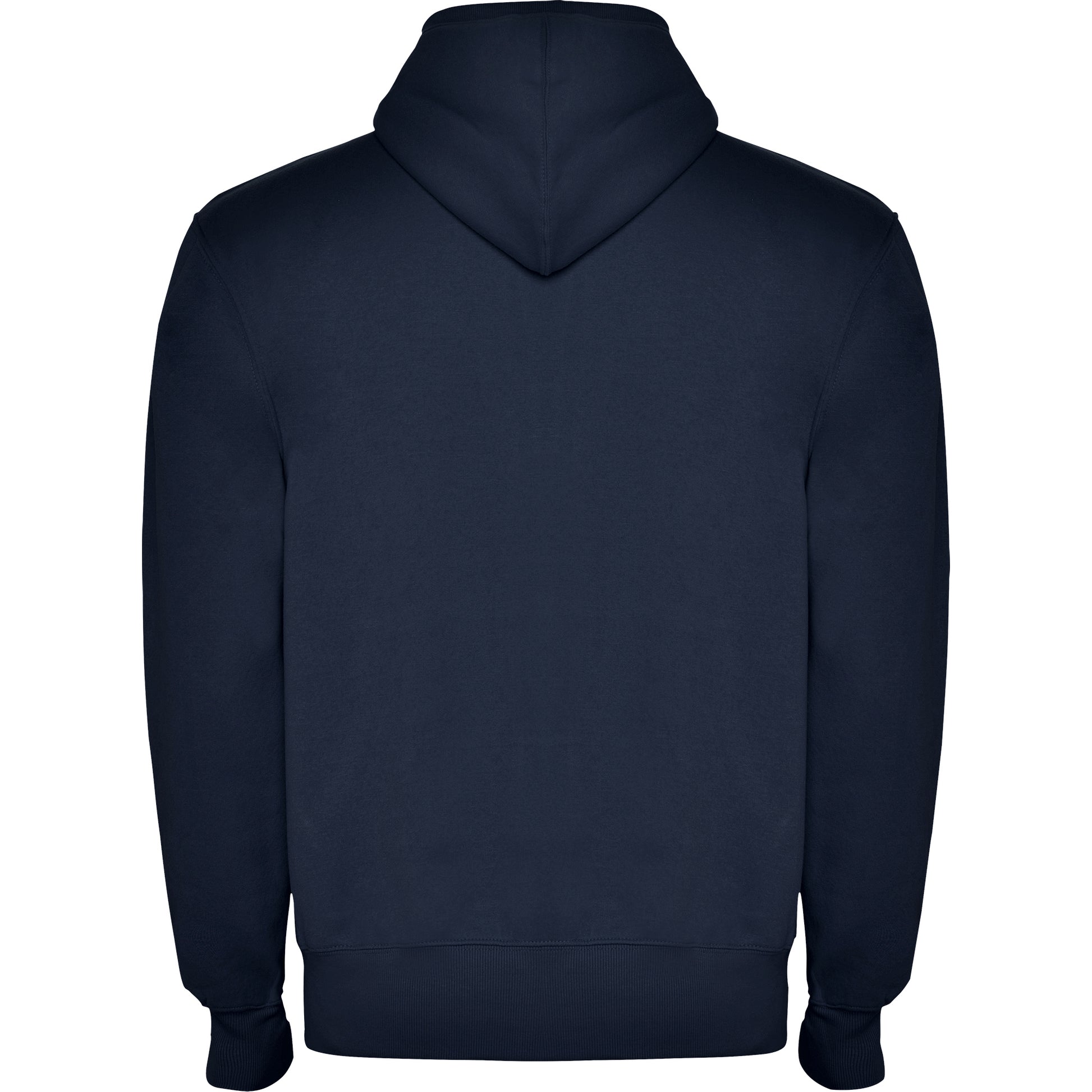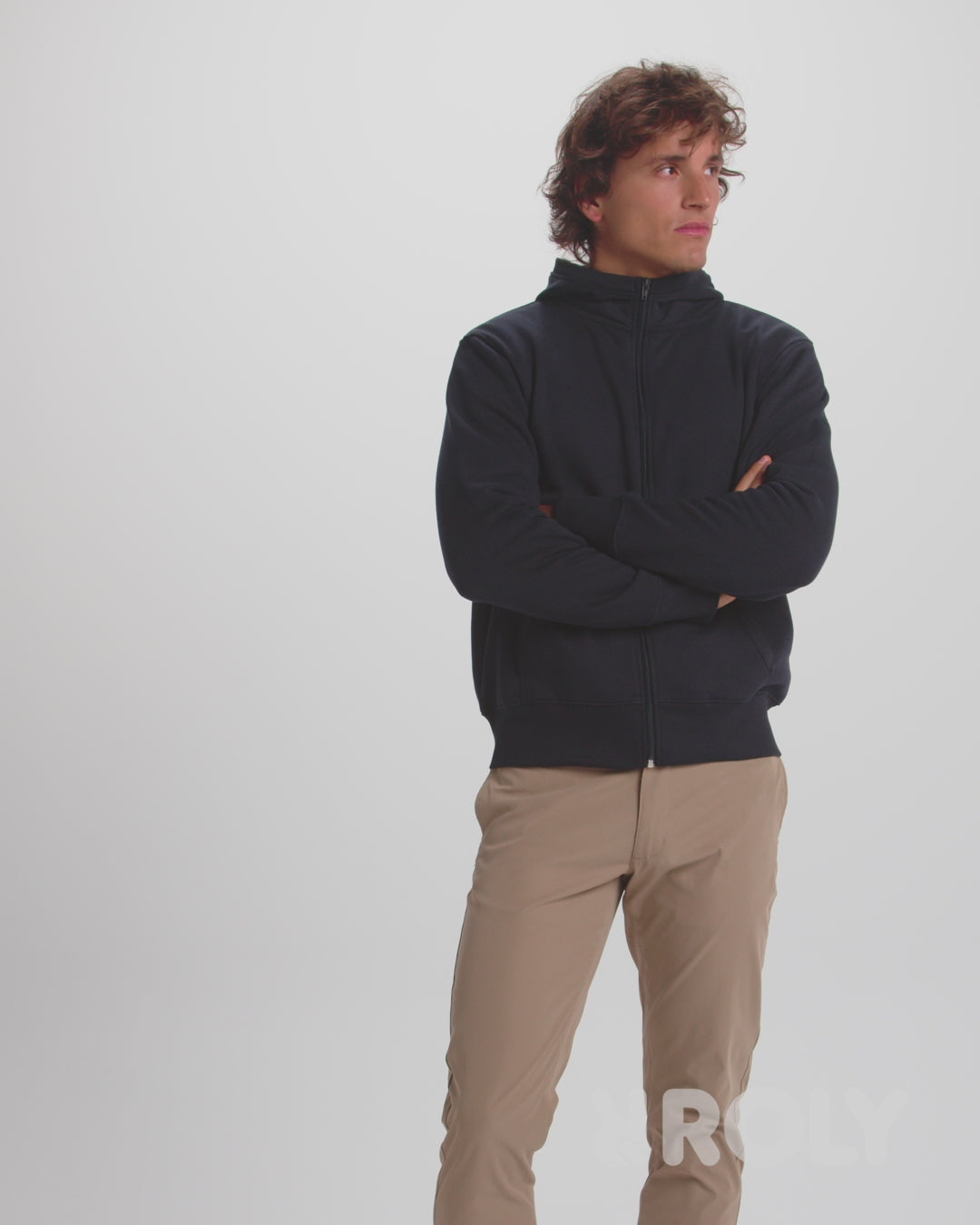 Sudadera con capucha, cuello alto y cremallera completa. Detalle canalé en contorno capucha y bolsillos. Bolsillo estilo canguro. Punto canalé 2×2 en puños y cintura.