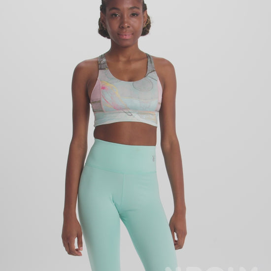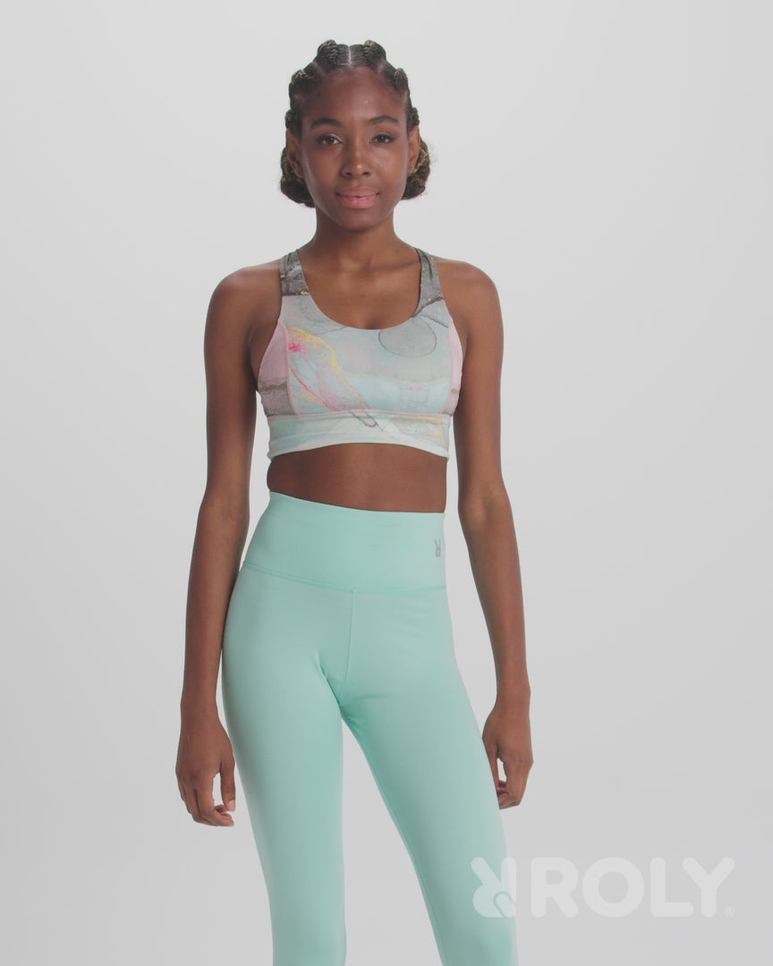 Top deportivo para mujer de alta sujeción. Tirantes entrelazados en espalda. Banda elástica de refuerzo en pieza bajo pecho. Doble tejido y forro. Copas de foam extraíbles. Logo Roly reflectante en la espalda.